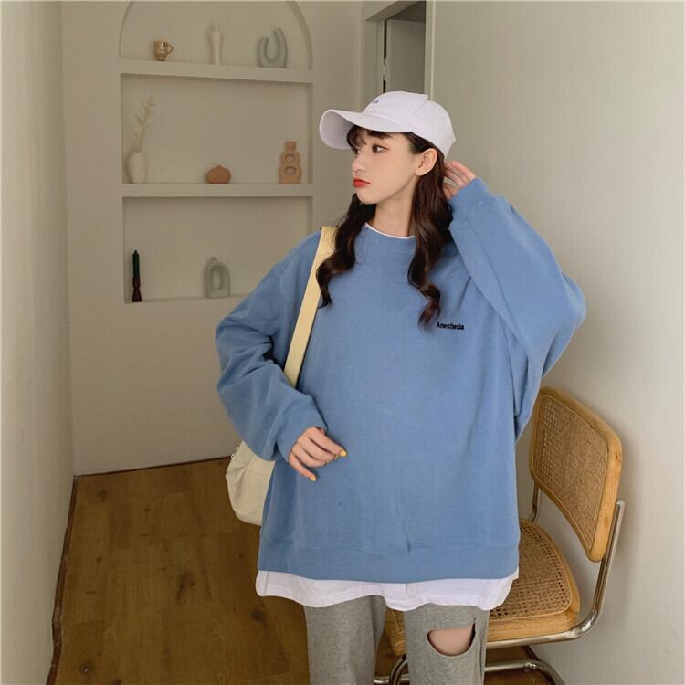 オーバーサイズ フェイクレイヤード 胸ロゴ ワンポイント トップス スウェット プルオーバー トレーナー ミディアム丈 チュニック丈 長袖 ドロップショルダー 襟なし クルーネック シンプル カジュアル おしゃれ お洒落 こなれ感 大人女子 ボーイッシュ ストリート 春 秋 冬 無地 学生 通学 デート お出かけ 公園デビュー 休日 普段使い 重ね着風 着回し 韓国風 オルチャン ファッション 体系カバー S M L XL 2XL 大きいサイズ ゆったり サイズ ブルー ブルーグレー グレー カラバリ