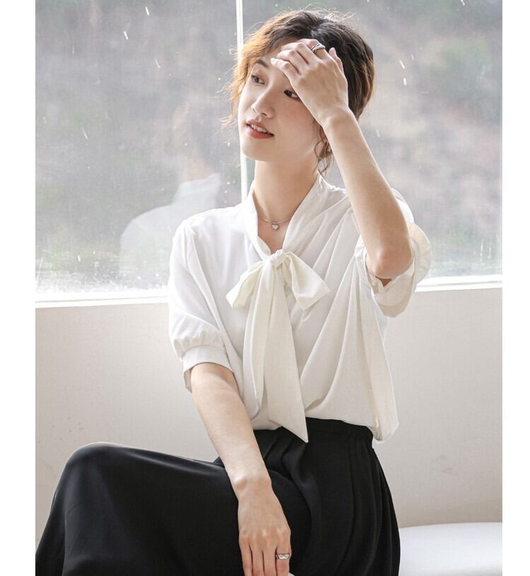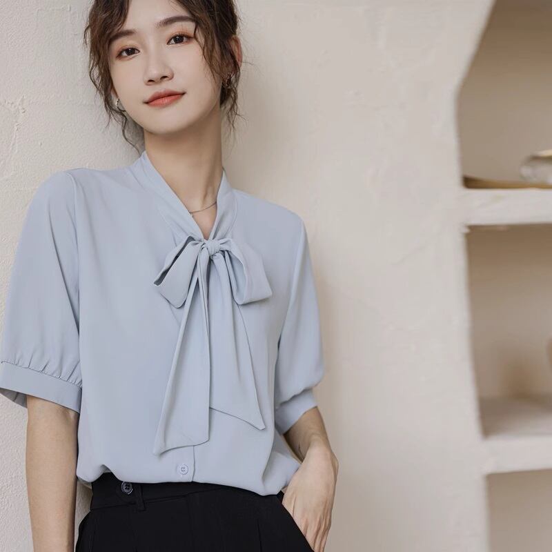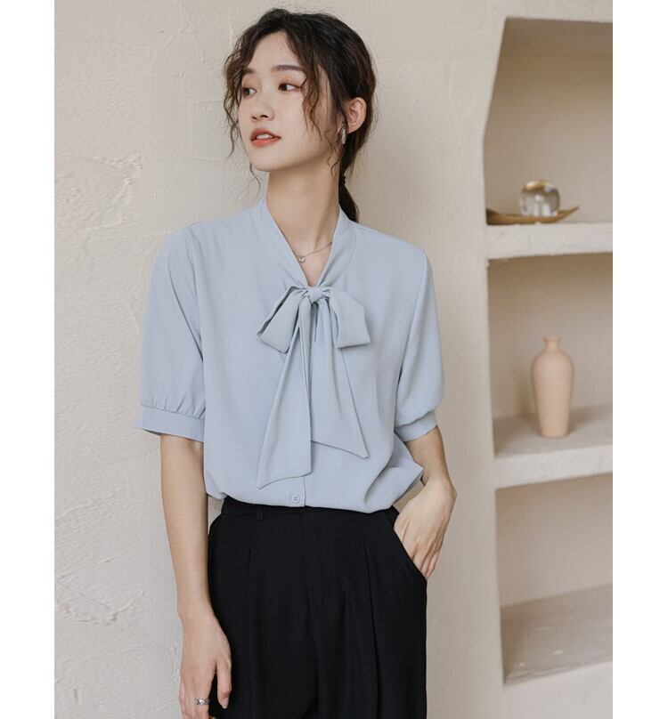 ボウカラー トップス ブラウス ミディアム丈 半袖 五分袖 パフスリーブ ボリューム袖 リボンタイネック Vネック フロントボタン 前開き かわいい 大人可愛い シンプル きれいめ 上品 おしゃれ お洒落 きちんと感 コンサバティブ フェミニン ジャケットイン 春 夏 無地 レディース ママ 女の子 オフィス ビジネス OL 通勤 学生 通学 デート お出かけ 重ね着 お呼ばれ 会食 韓国風 オルチャン ファッション コーデ S M L XL ゆったり サイズ 白 ホワイト 青 ブルー ピンク カラバリ