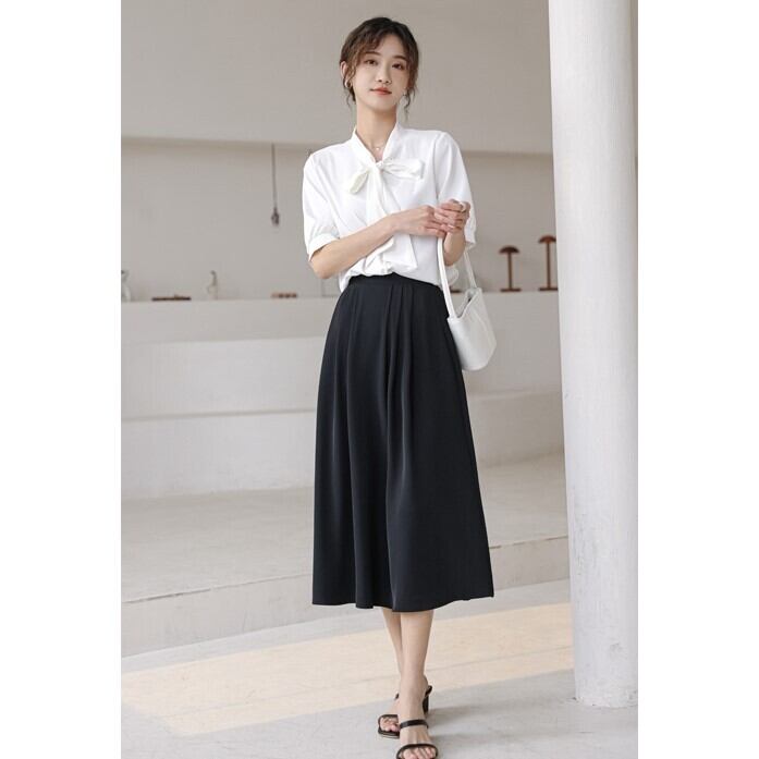 肘付近まである半袖〜五分袖ぐらいの控えめパフスリーブで自然に二の腕カバーでき、ボトムに裾インして着るとメリハリ感がある着こなしに。