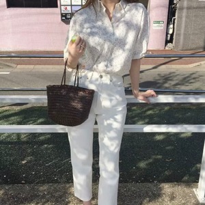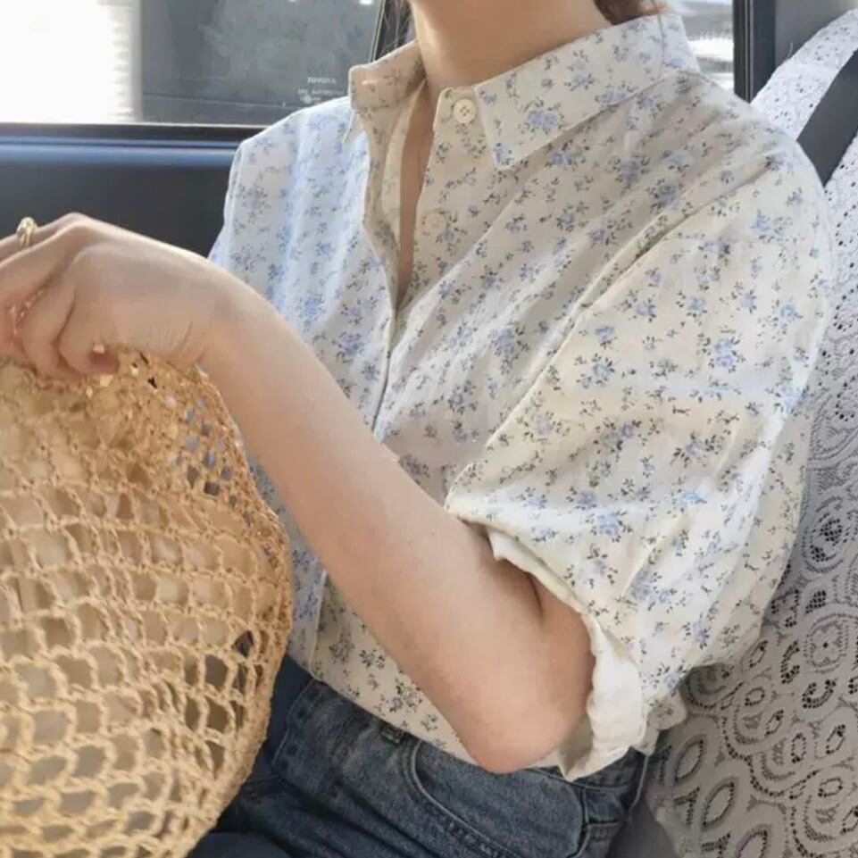 爽やかな白地に小花柄が特徴のシャツブラウス。