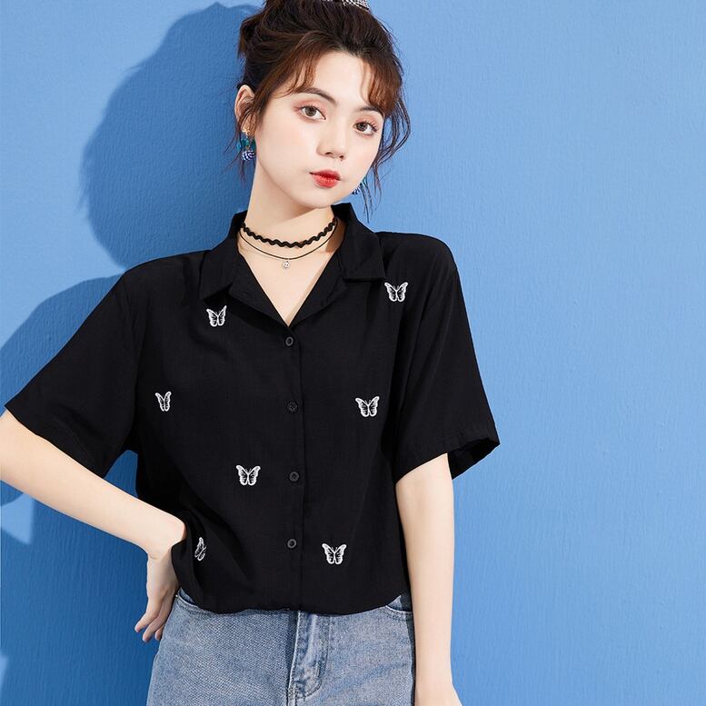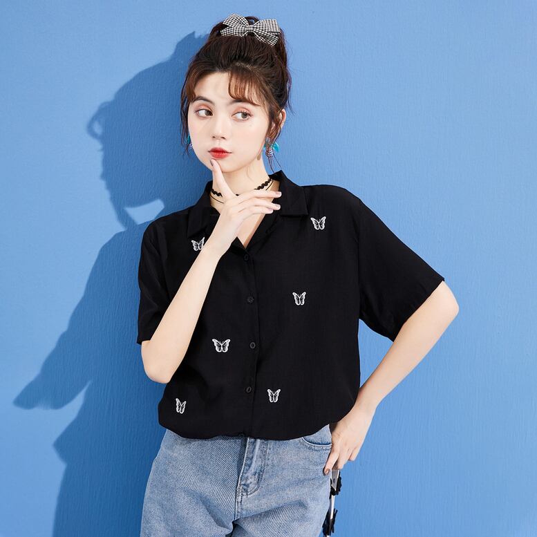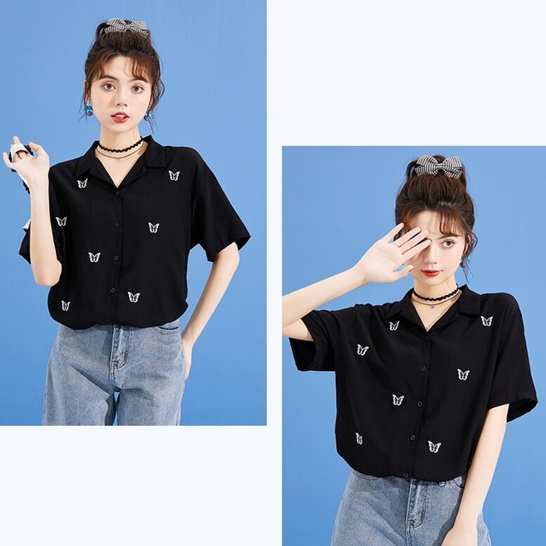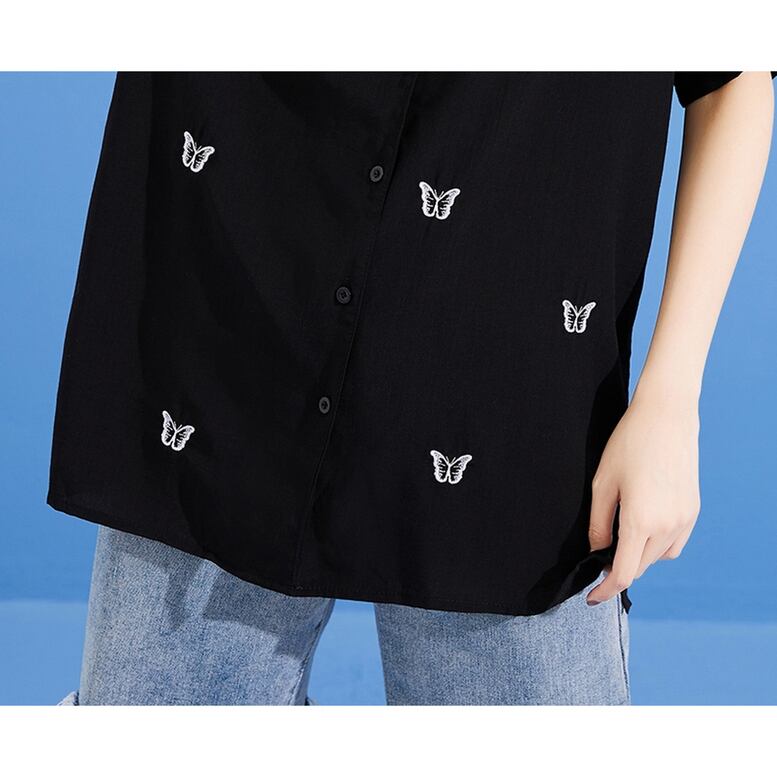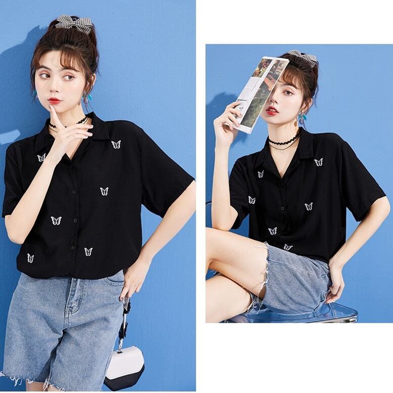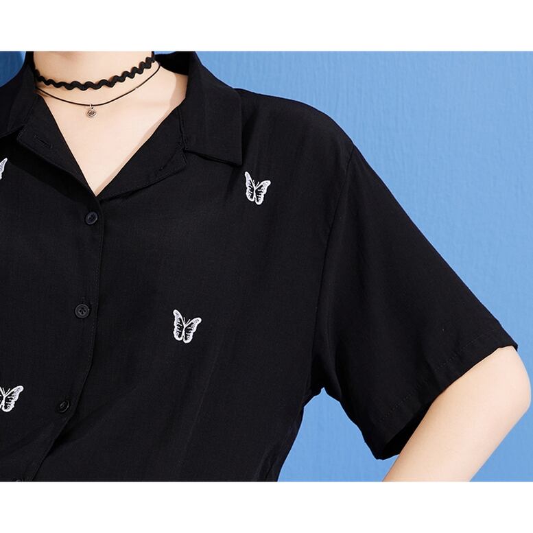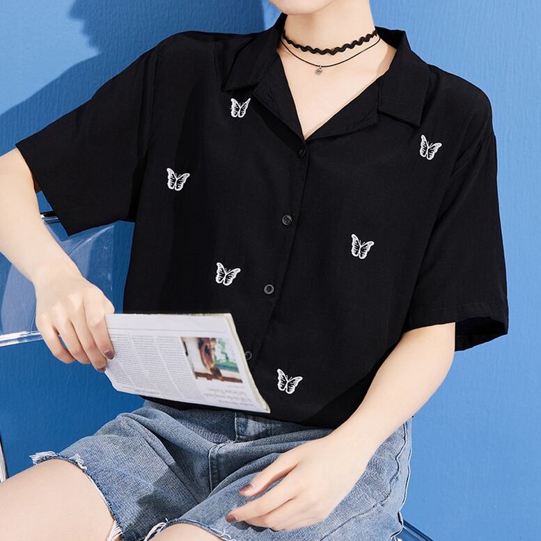 シャツ トップス 蝶々柄オープンカラーシャツ レディース 開襟シャツ 蝶々 半袖 襟付き ブラウス 黒 ブラック ハリ感 オシャレ シアー シンプル きちんと感 可愛い キレイめ 上品 フェミニン モード トラッド シック 知的 ハンサム マニッシュ カジュアル 春 夏 秋 冬 デイリー おでかけ オンオフ兼用 公園コーデ アウトドア 普段着 コンパクト スマート 細見え スタイルアップ 高見え 新鮮 上級者 主役級 鮮度アップ 動きやすい 軽やか ゆったり 体型カバー インスタ映え トレンド モノトーン