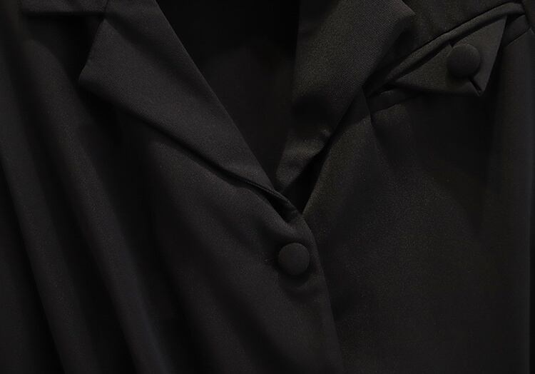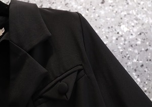 フロントボタンはくるみボタンになっていて女の子らしい印象に。サイドにボタン留めがあり華奢見え効果も。