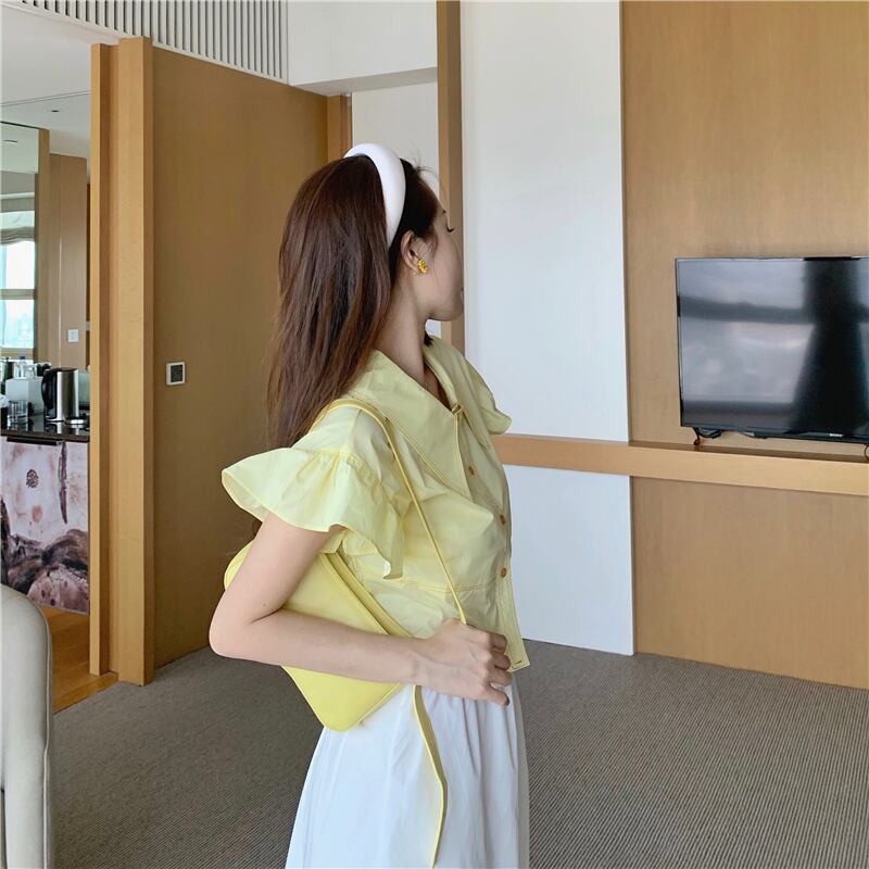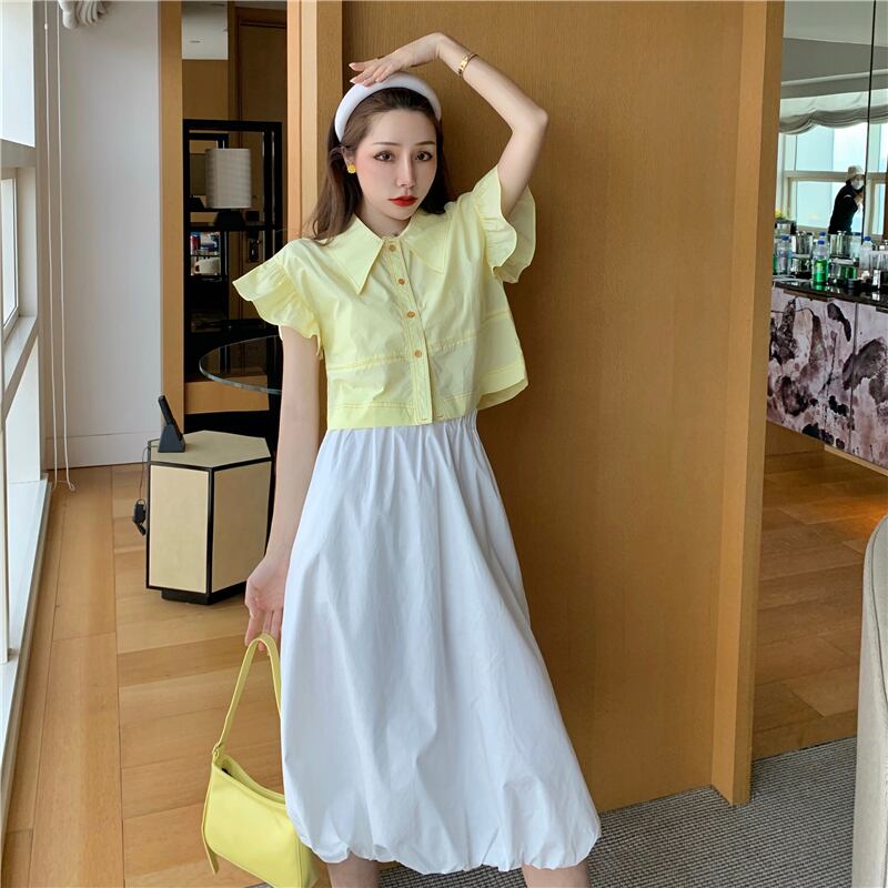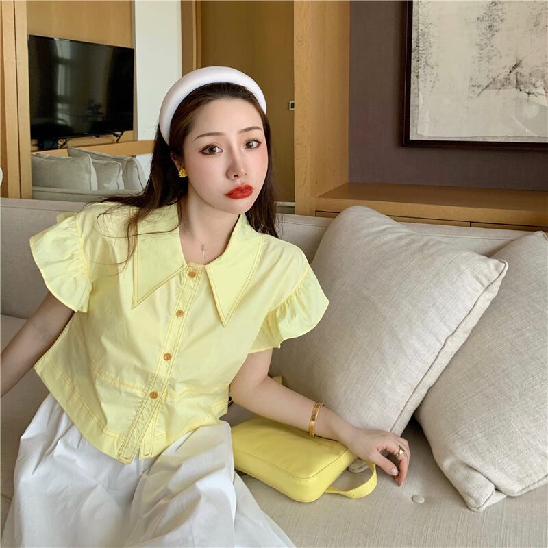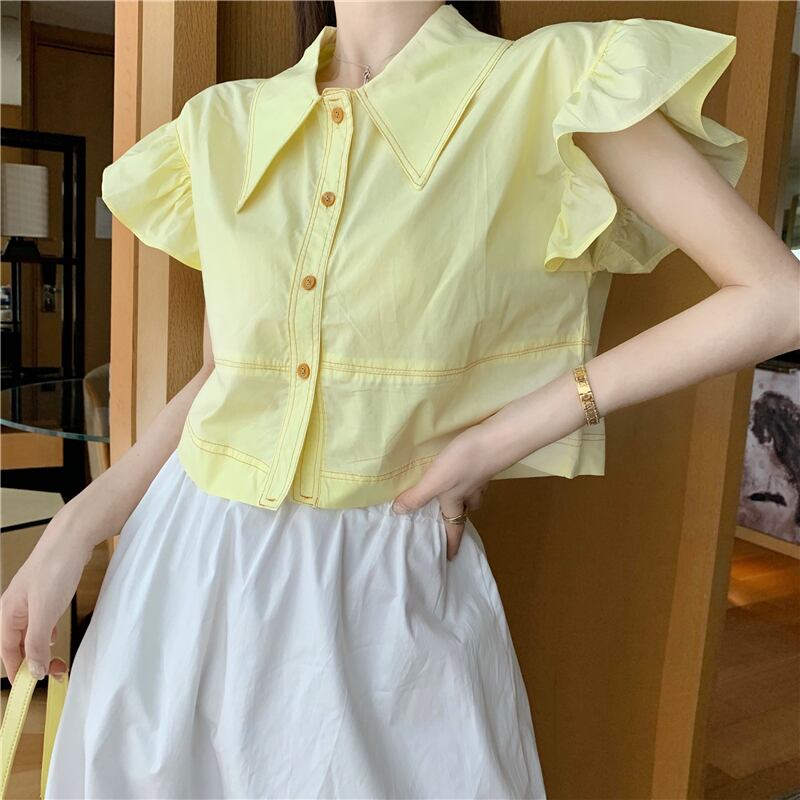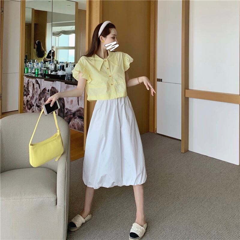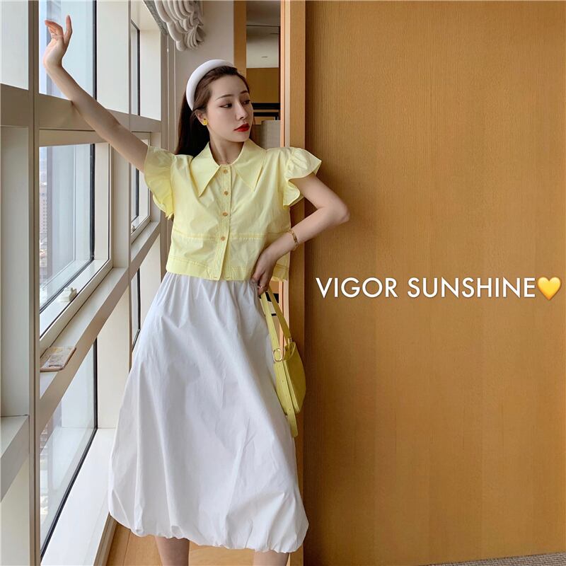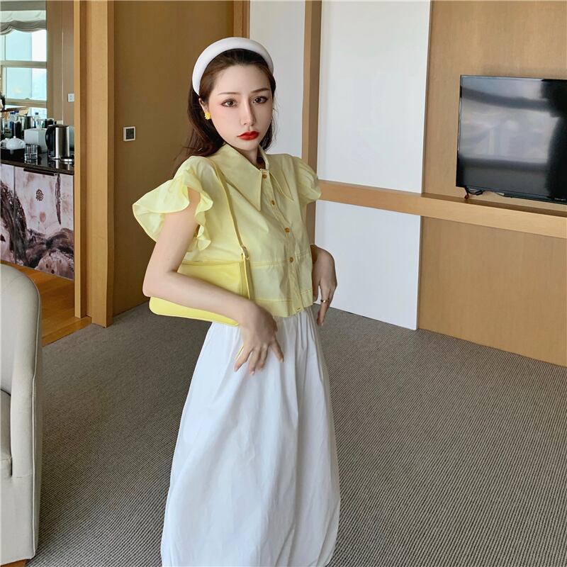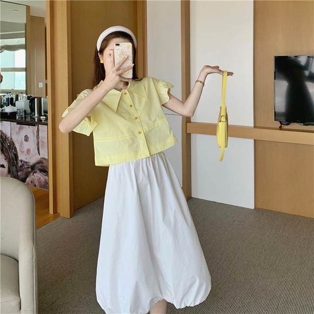 フリル袖 配色ステッチ クロップド ブラウス 裾ギャザー バルーン風 ボトム セットアップ トップス ショート丈 半袖 ドロップショルダー 襟付き フロントボタン 切り替えデザイン 前開き スカート ミディアム丈 ミモレ丈 Aライン ウエストゴム かわいい 大人可愛い シンプル カジュアル きれいめ 上品 おしゃれ こなれ感 キュート 個性的 存在感 春 夏 無地 学生 通学 デート お出かけ 女子会 普段使い 休日 韓国風 オルチャン ファッション コーデ 脚長 S M L 白 ホワイト 黄色 イエロー