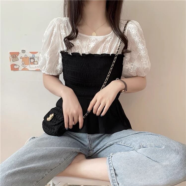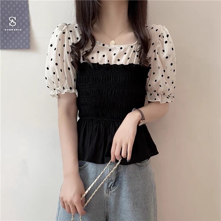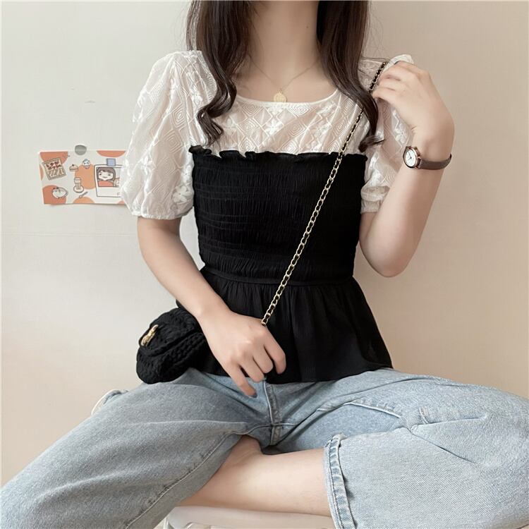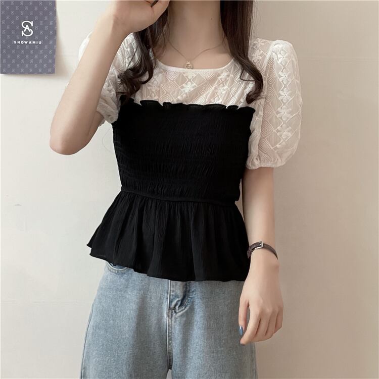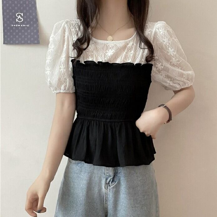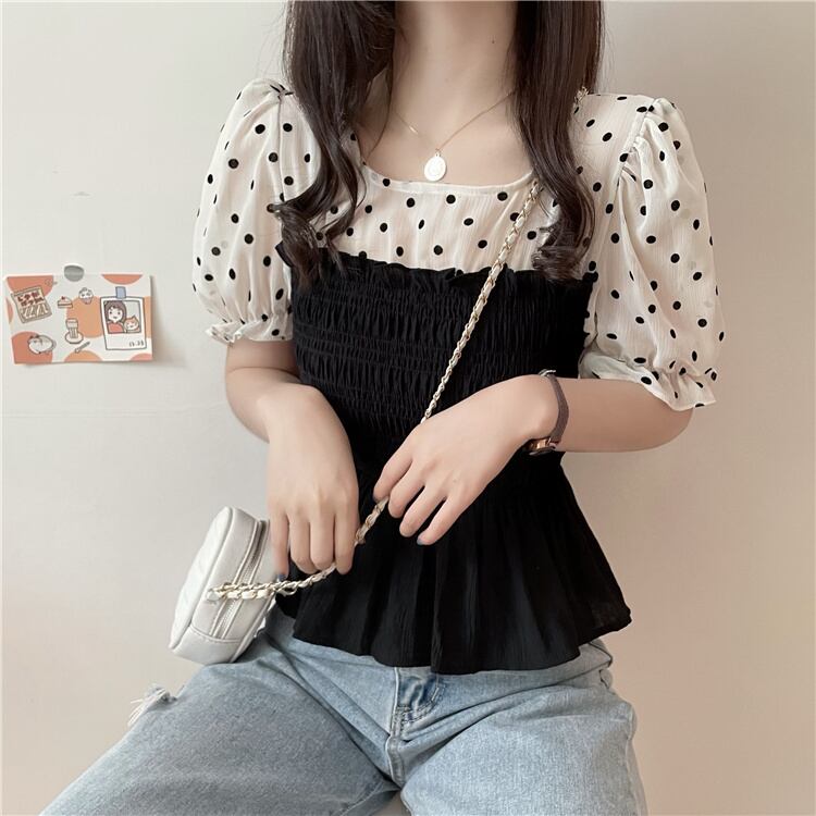 ビスチェレイヤード風 シャーリング切替え 2タイプ ふんわり袖 ドッキング クロップド ペプラム風 トップス ブラウス ショート丈 半袖 パフスリーブ ボリューム袖 襟なし ラウンドネック レース 切り替えデザイン 異素材MIX 透け感 シアー かわいい 大人可愛い シンプル カジュアル きれいめ おしゃれ お洒落 キュート 存在感 春 夏 水玉 ドット柄 花柄 無地 レディース ママ 女の子 学生 通学 デート お出かけ 女子会 休日 普段使い 韓国風 オルチャン 脚長 S M L XL 黒 ブラック