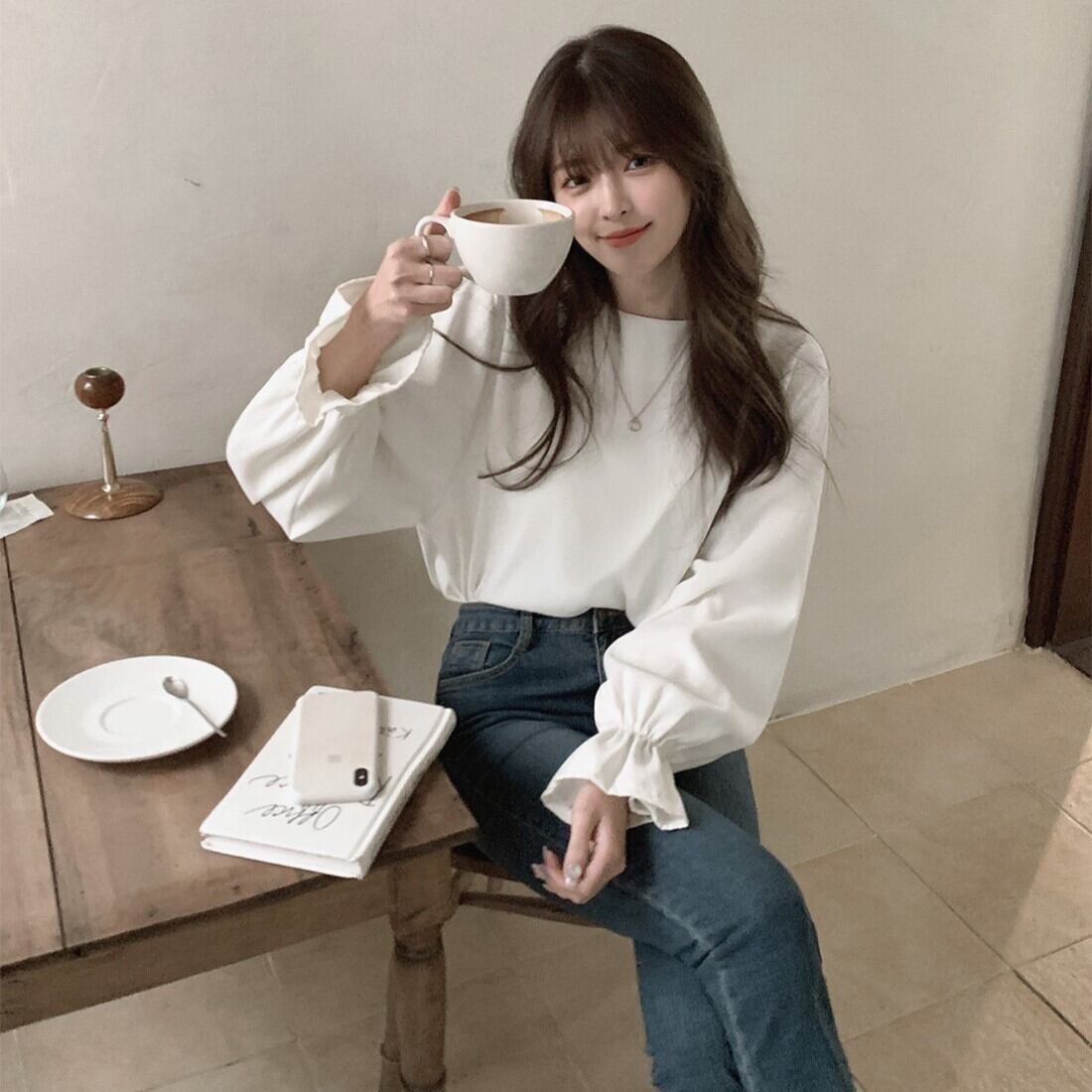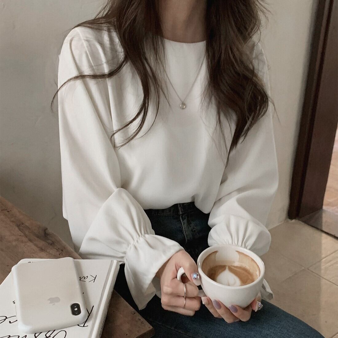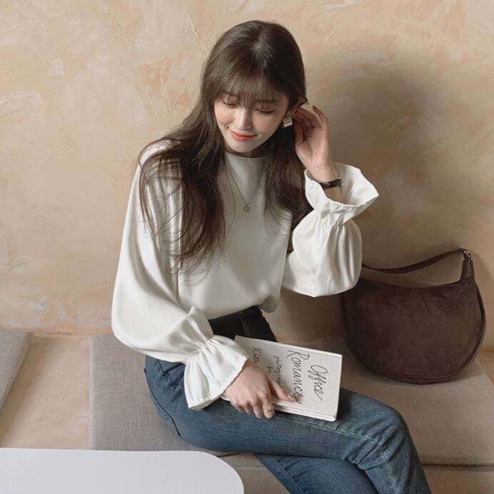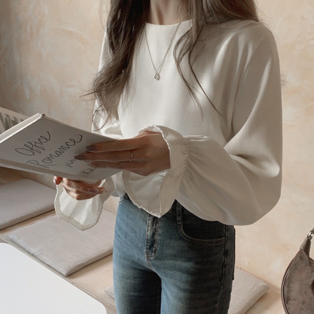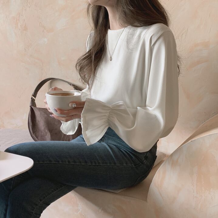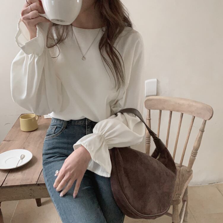 トップス カットソー 白トップス 袖あり 長袖 ボリューム袖 フレアスリーブ ラウンドネック ストレート Iライン 薄手 かわいい 大人可愛い きれいめ シンプル 大人 おしゃれ お洒落 大人可愛い 大人女子 こなれ感 ラブリー キュート ガーリー エレガント 主役級 存在感 とろみ感 抜け感 無地 春 秋 10代 20代 30代 レディース 女性用 ママ OL 学生 通学 デート お出かけ 女子会 休日 イベント 旅行 ホテル レストラン 着回し 普段使い モテ S M L 白 ホワイト