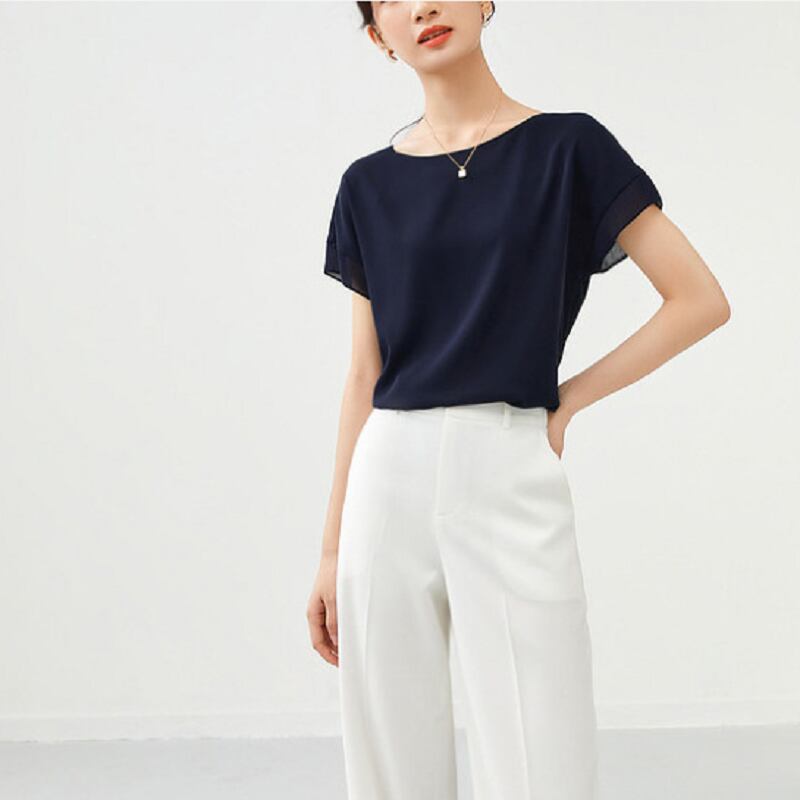 ボトムスを選ばないシンプルデザインのシフォンシャツ