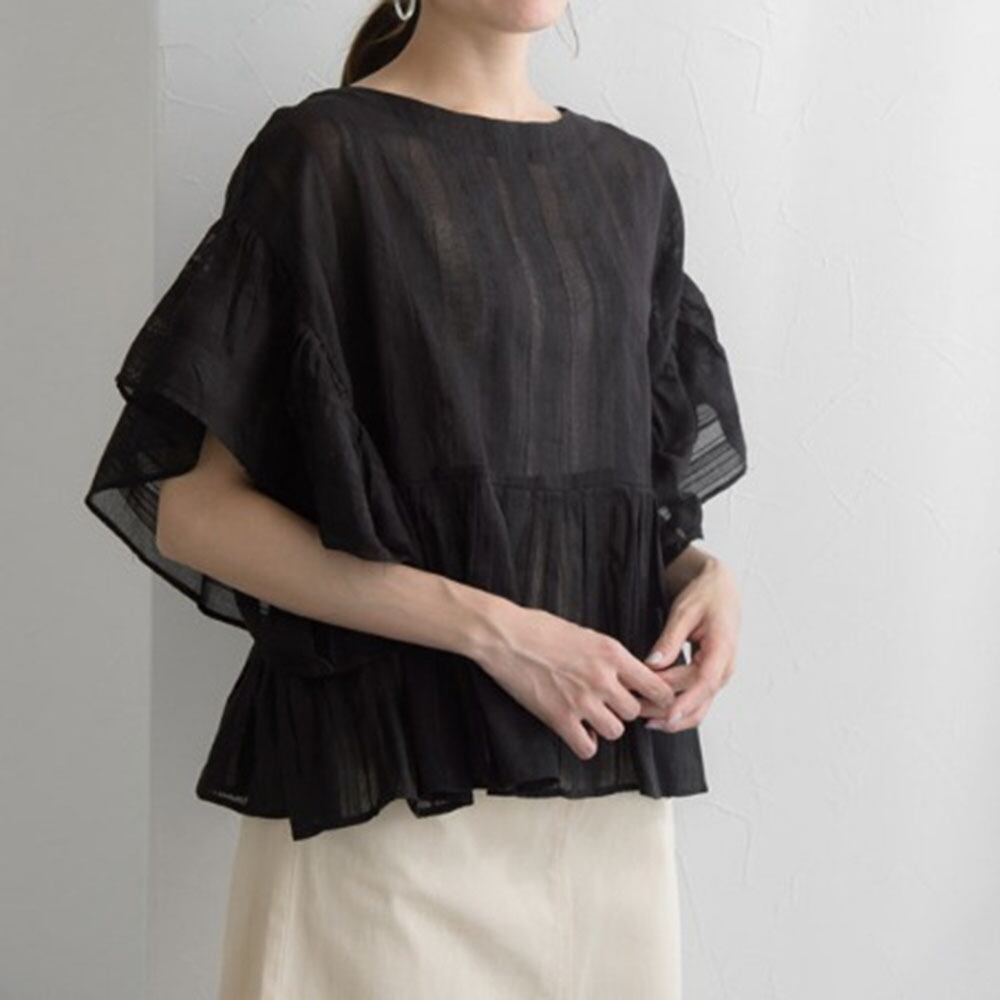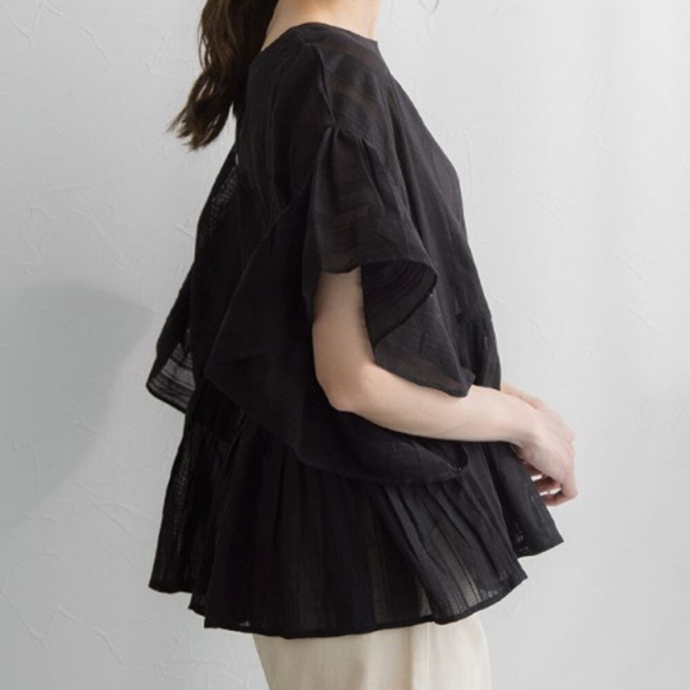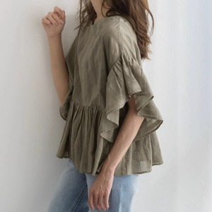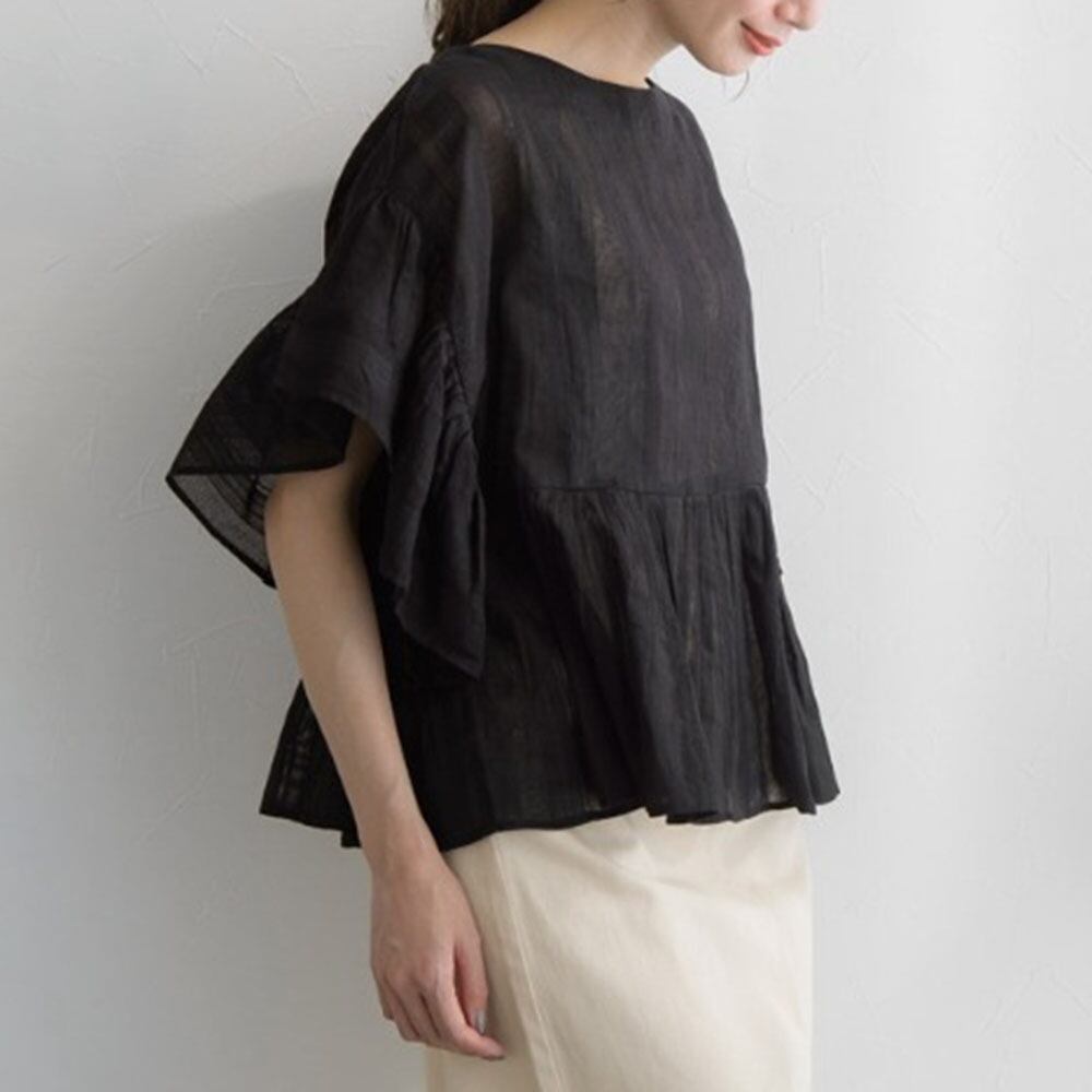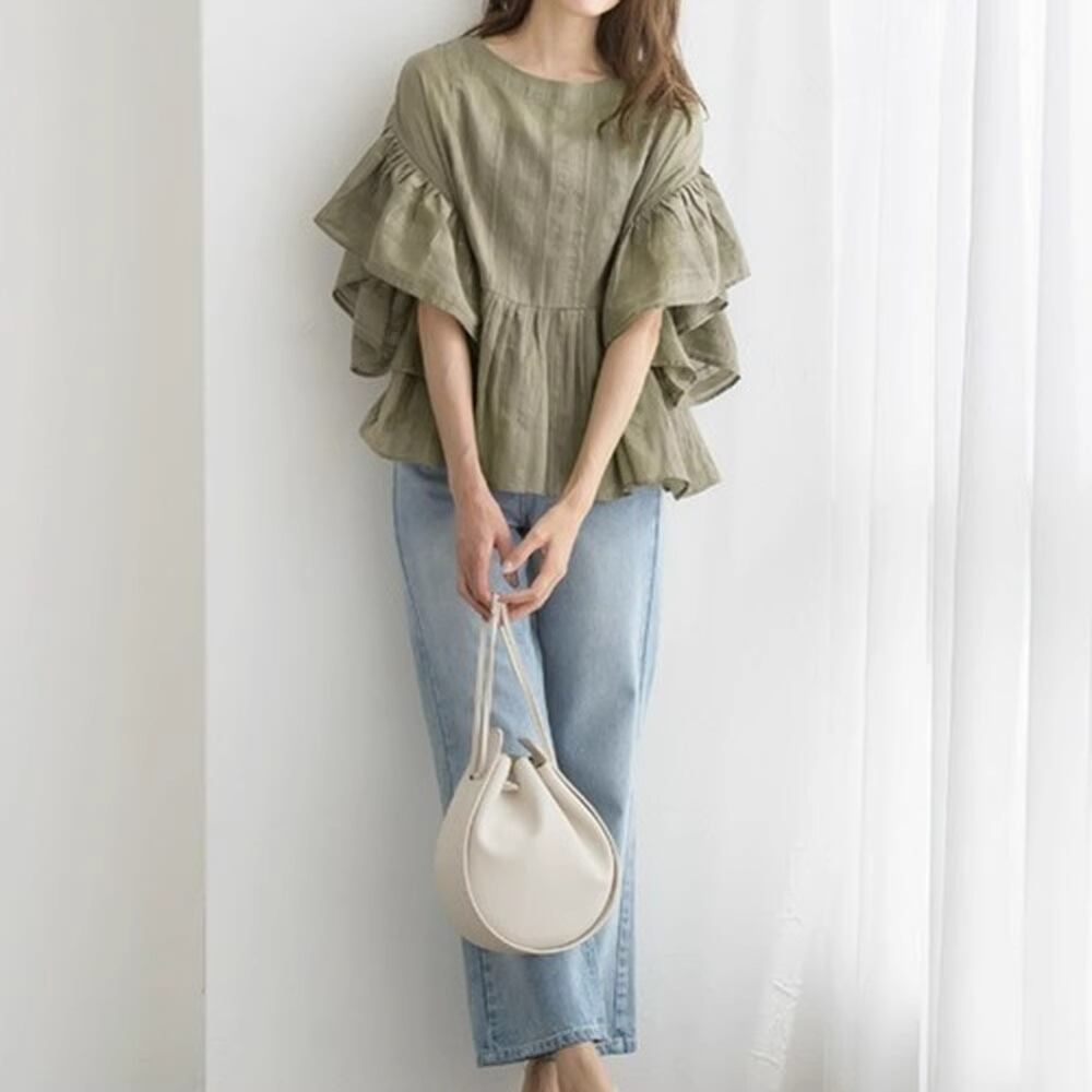 動くたびに揺れるフリル袖と裾が綺麗目な印象に