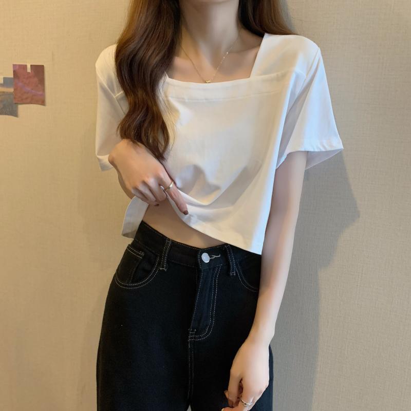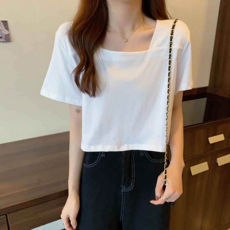 スクエアネックで首周りのすっきり感のある半袖Tシャツです