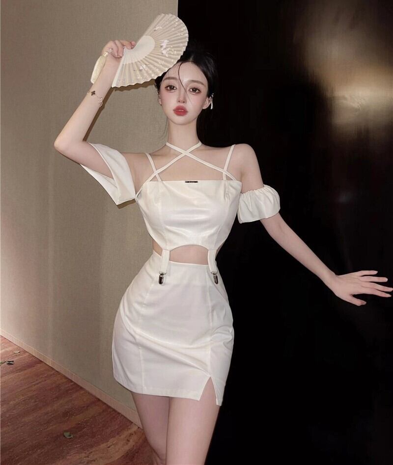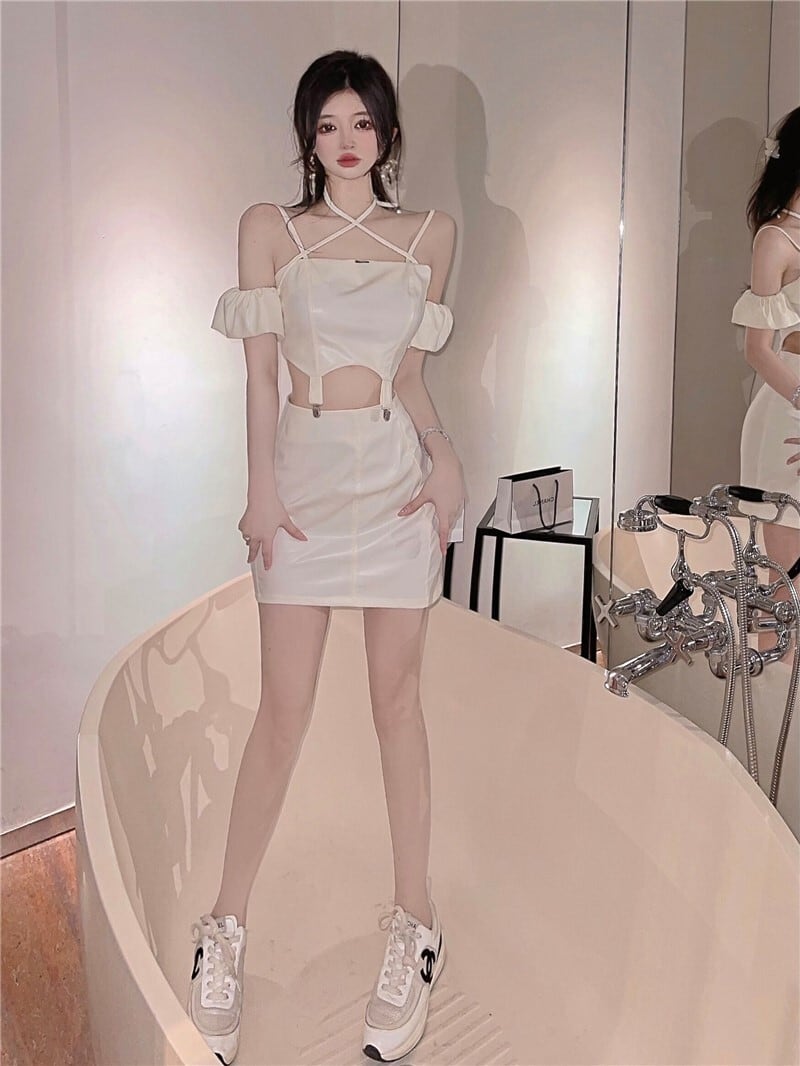 クロスホルターネックデザインのオフショルダートップスとタイトスカートのセットアップ。