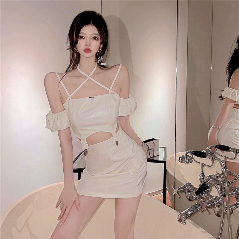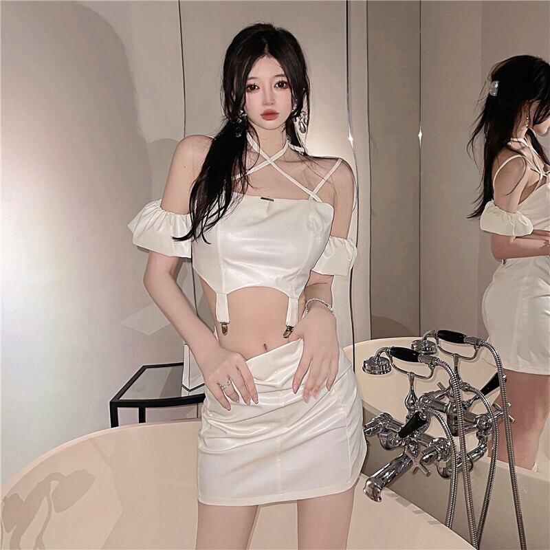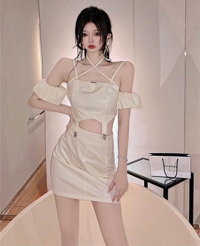 裾サスペンダー付き ボディコンシャス クロスホルターネック トップス ミニスカート セットアップ クロップドトップス キャミソール ショート丈 オフショルダー ストラップ付き 襟なし ボトムス スカート マイクロミニ丈 ミニ丈 膝上 タイト スリム 細身 スマート フロントスリット フェイクレザー シンプル カジュアル おしゃれ 大人っぽい セクシー かっこいい クール 存在感 肌見せ 女っぽ 夏 無地 レディース 女の子 イベント クラブ ナイトドレス 韓国風 オルチャン スタイル S M L ベージュ