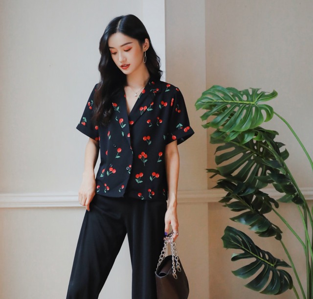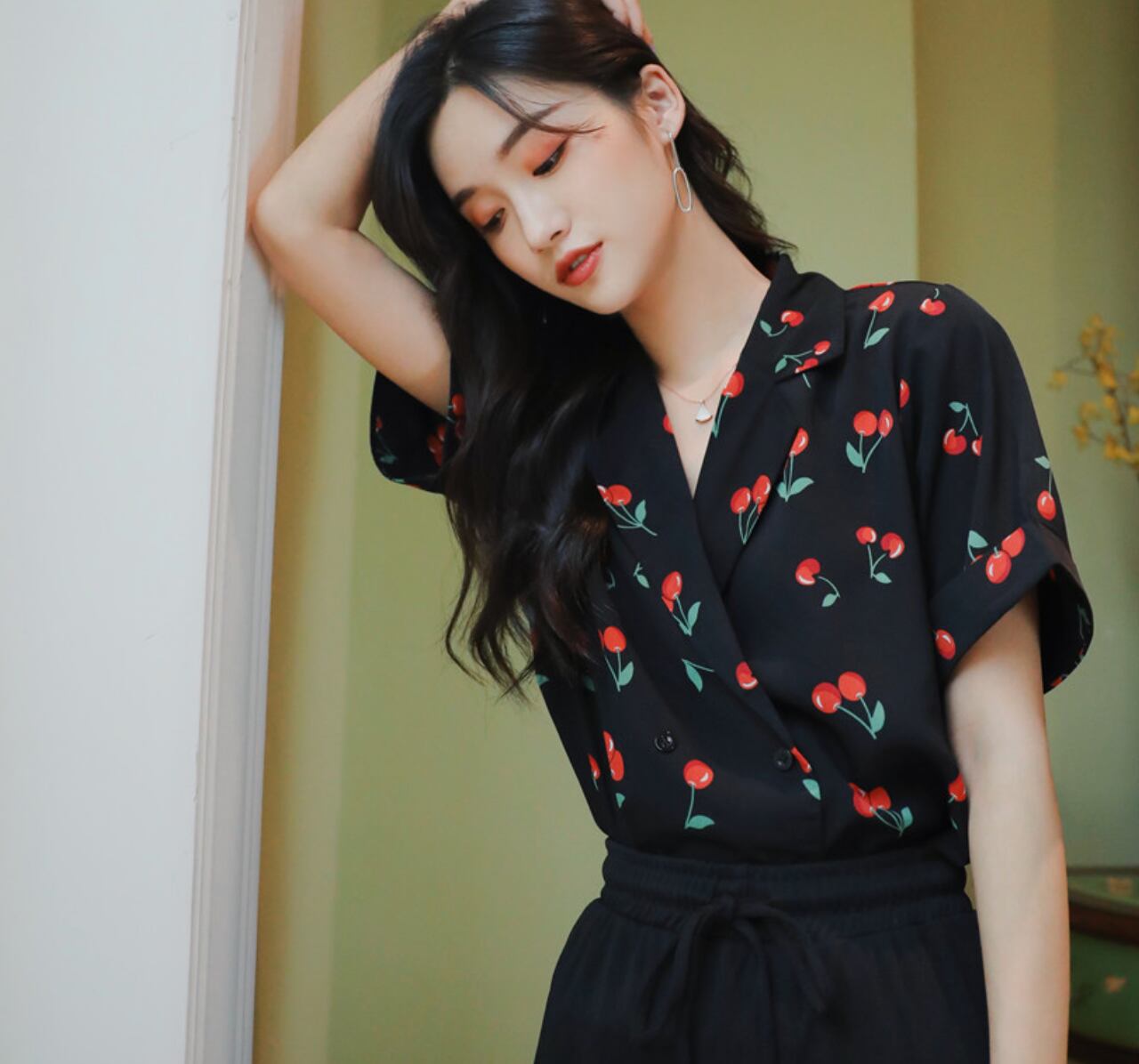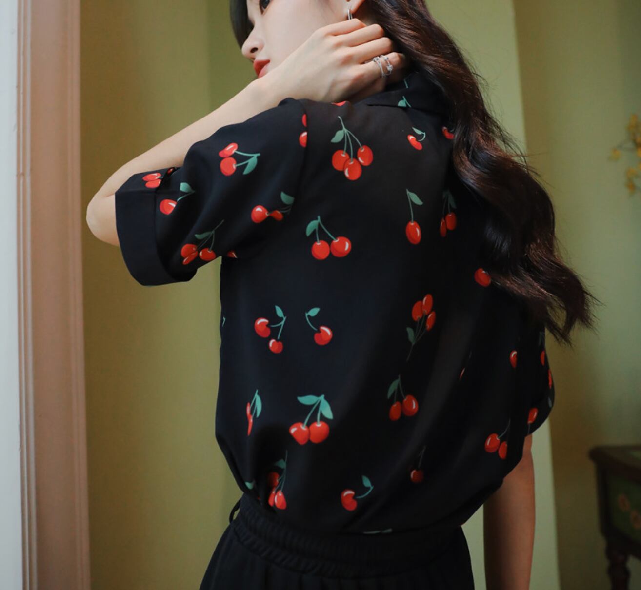 さくらんぼ柄が可愛い半袖開襟シャツ。