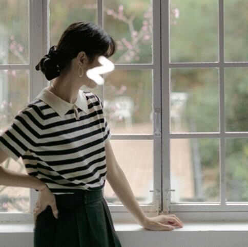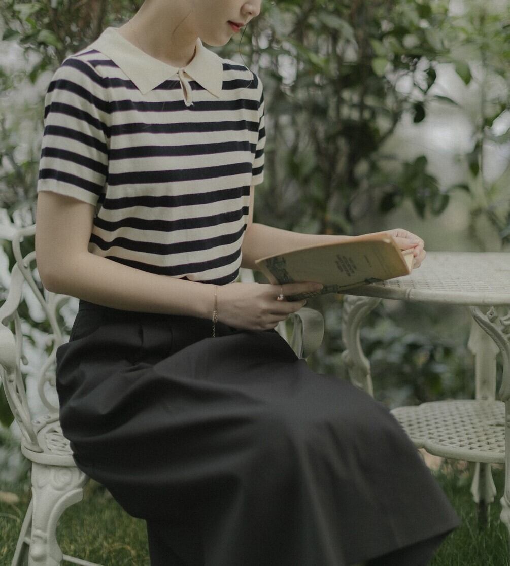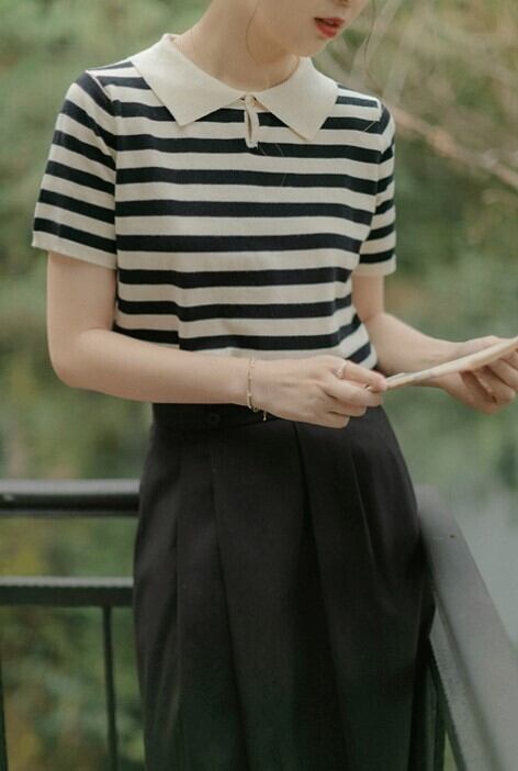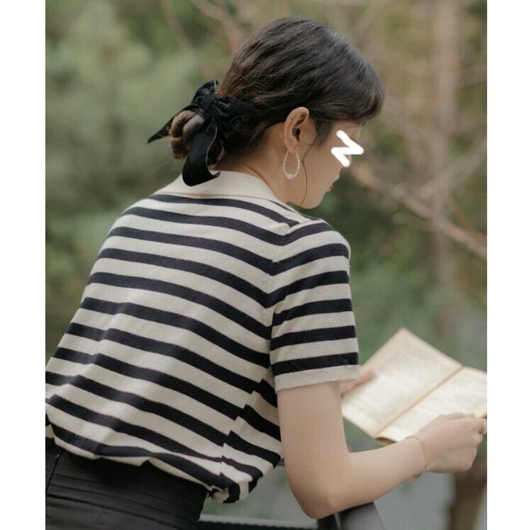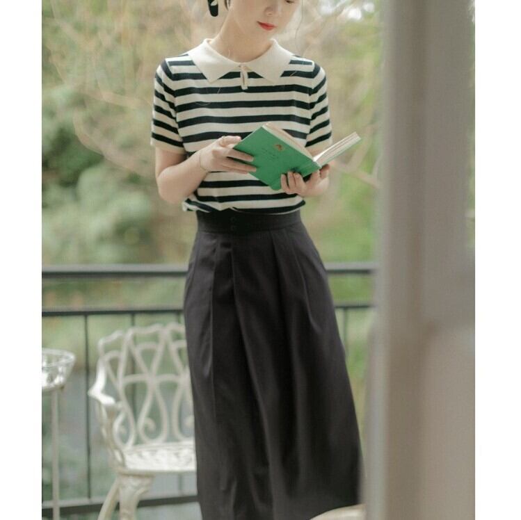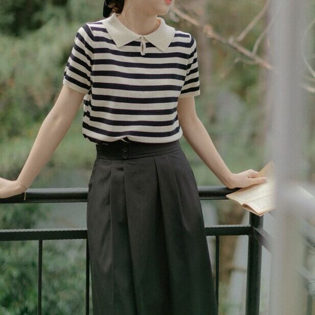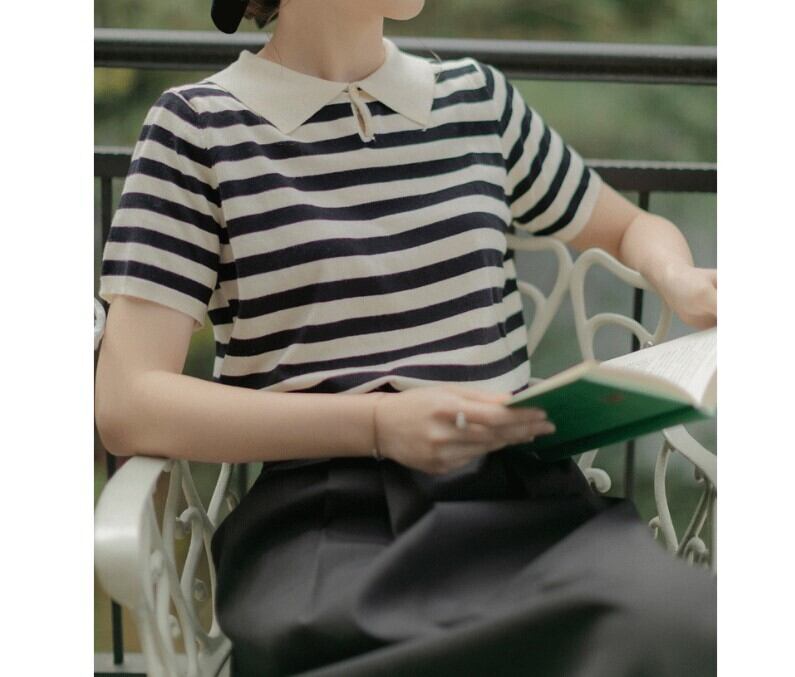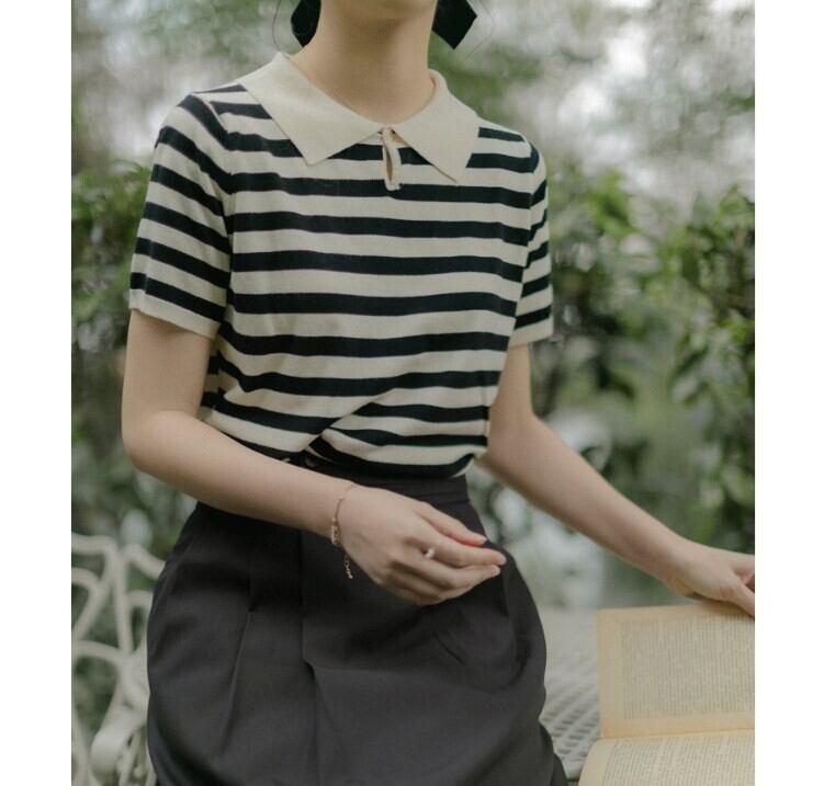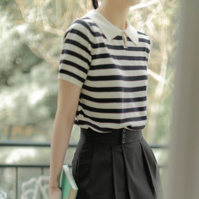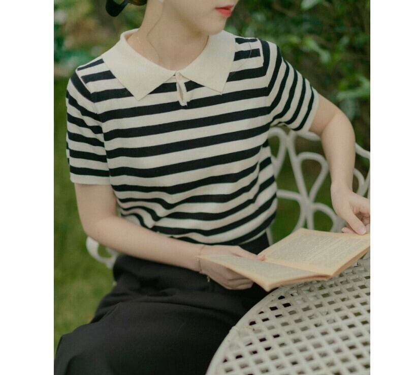 フレンチシック サマーニット トップス ニットソー ミディアム丈 袖あり 半袖 襟付き ポロカラー ティアドロッププラケット 首元ワンボタン ニット 伸縮性 かわいい 大人可愛い シンプル カジュアル きれいめ おしゃれ お洒落 レトロ 上品 春 夏 ボーダー柄 シマ 横縞 レディース 女性用 ママ 女の子 学生 通学 デート お出かけ 公園デビュー 女子会 休日 普段使い 韓国風 オルチャン ファッション コーデ スタイル 体系カバー S M L XL ゆったり サイズ 黒 ブラック モノトーン