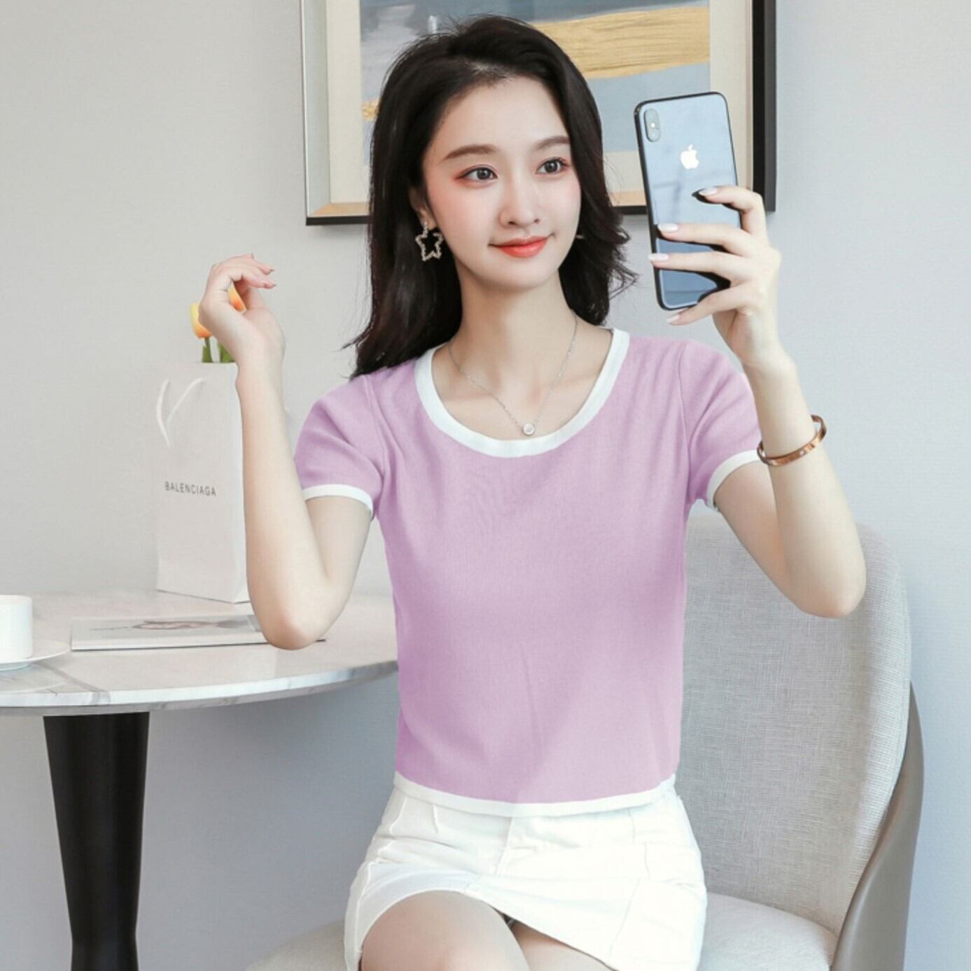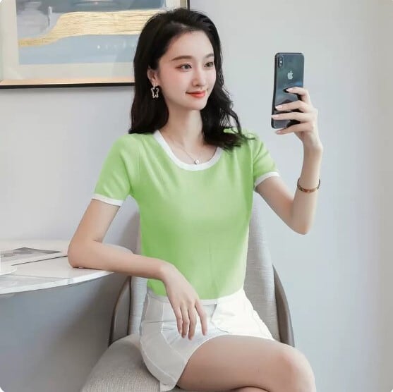 色豊富 白トリミング クロップド サマーニット トップス ニットソー ショート丈 袖あり 半袖 襟なし ラウンドネック スリム 細身 スマート すっきり ニット 伸縮性 かわいい 大人可愛い シンプル カジュアル きれいめ 上品 おしゃれ お洒落 春 夏 無地 レディース ママ 女の子 OL 通勤 学生 通学 デート お出かけ 女子会 休日 普段使い 着回し 韓国風 オルチャン ファッション スタイルアップ 脚長 S M L ブラック グレーブルー グリーン パープル ワインレッド カーキ カラバリ