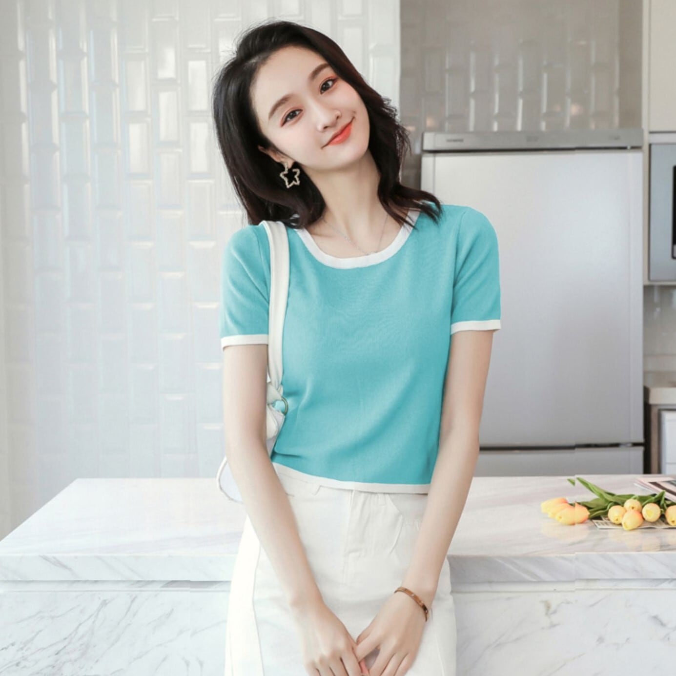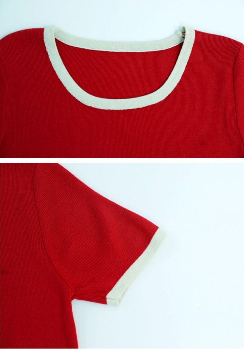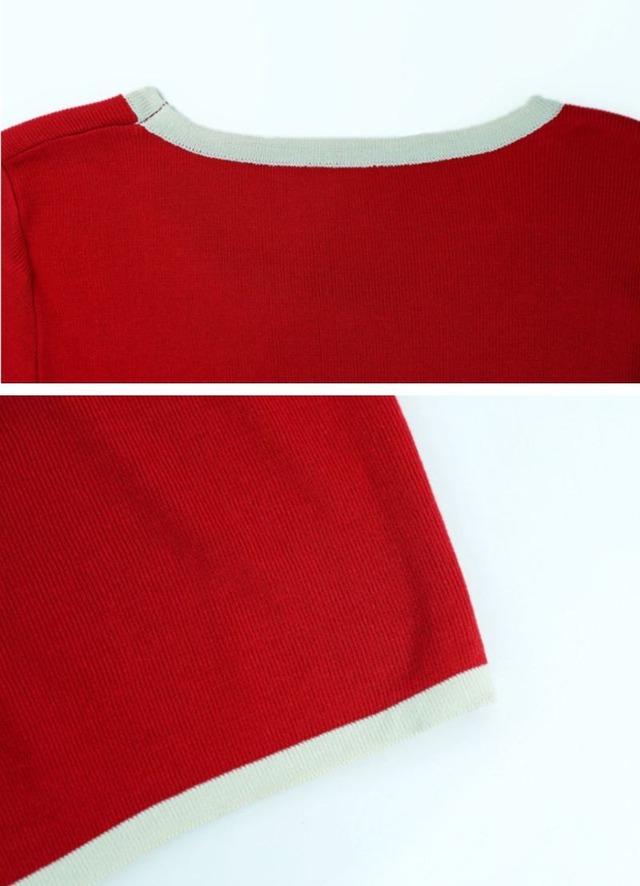 首周りと袖口に白の配色トリミングをきかせたショート丈ニットソー。