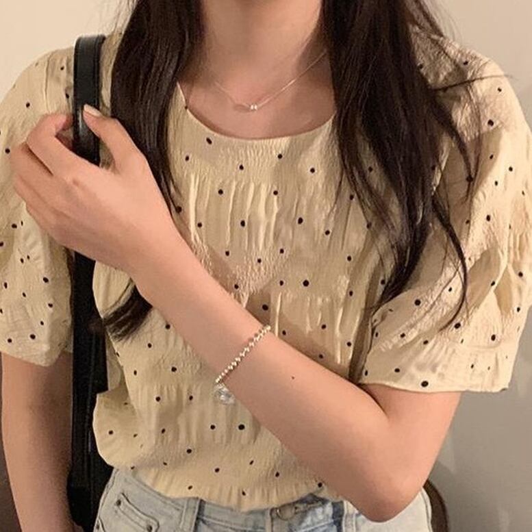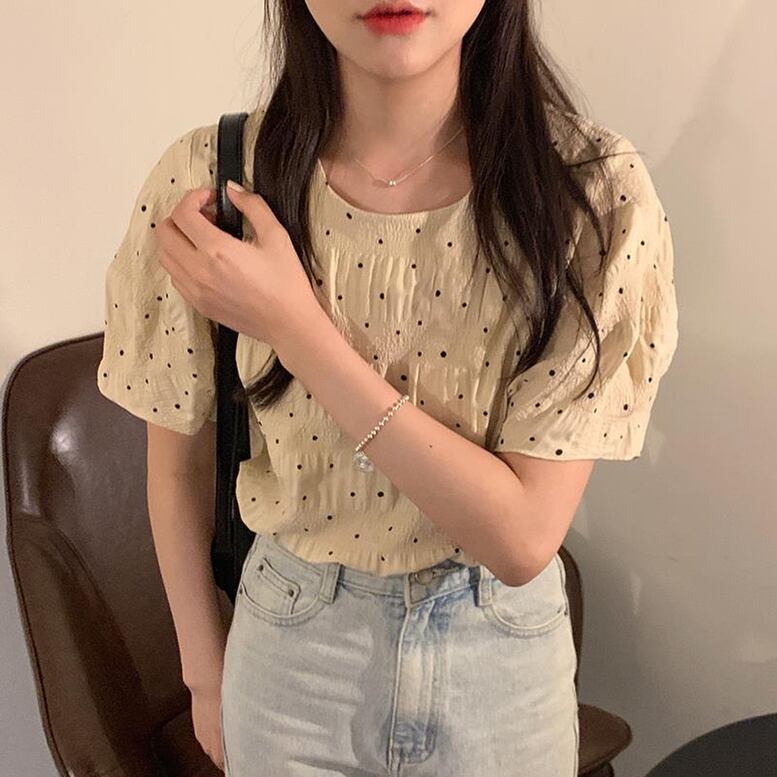 ブラウス トップス ドットパフブラウス レディース シフォンブラウス シャツ ドット柄 パフスリーブ 半袖 ラウンドネック ベージュ オフィス オシャレ シアー シンプル きちんと感 可愛い キレイめ 上品 フェミニン カジュアル 春 夏 秋 冬 デイリー おでかけ オンオフ兼用 普段着 コンパクト スマート 細見え スタイルアップ 高見え 新鮮 上級者 主役級 鮮度アップ 動きやすい 軽やか ゆったり 体型カバー インスタ映え トレンド アースカラー 大人可愛い ガーリー キュート 通勤 通学 デート