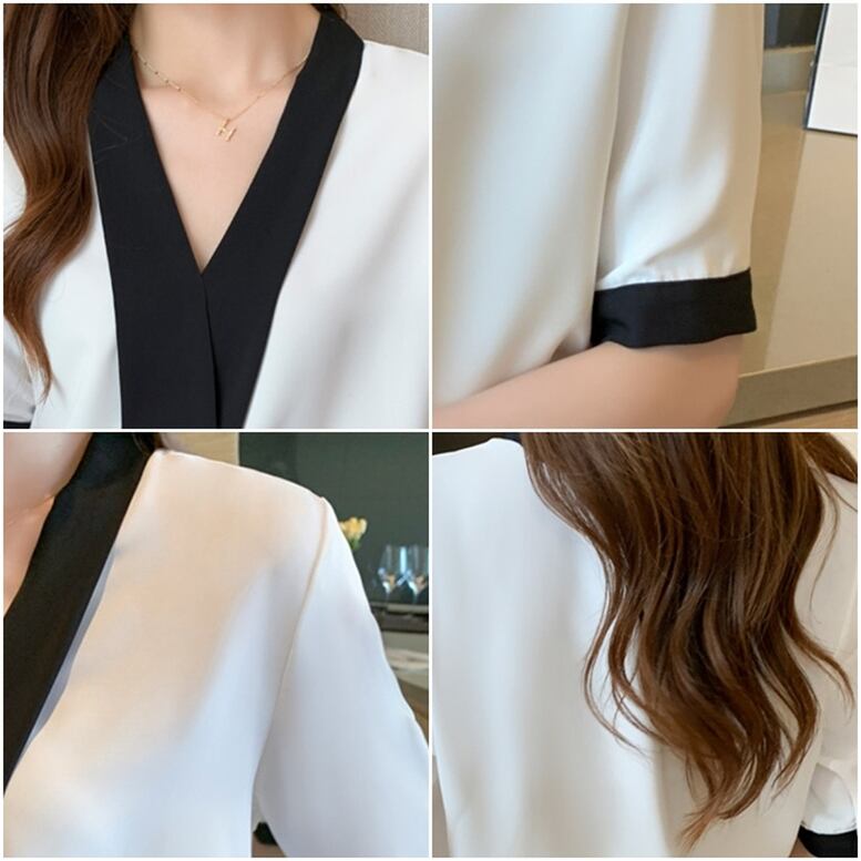 シャツ トップス カシュクールノーカラーシャツ レディース Vネックシャツ シフォンシャツ 半袖 バイカラーシャツ ブラウス ノーカラー 無地 白 ホワイト