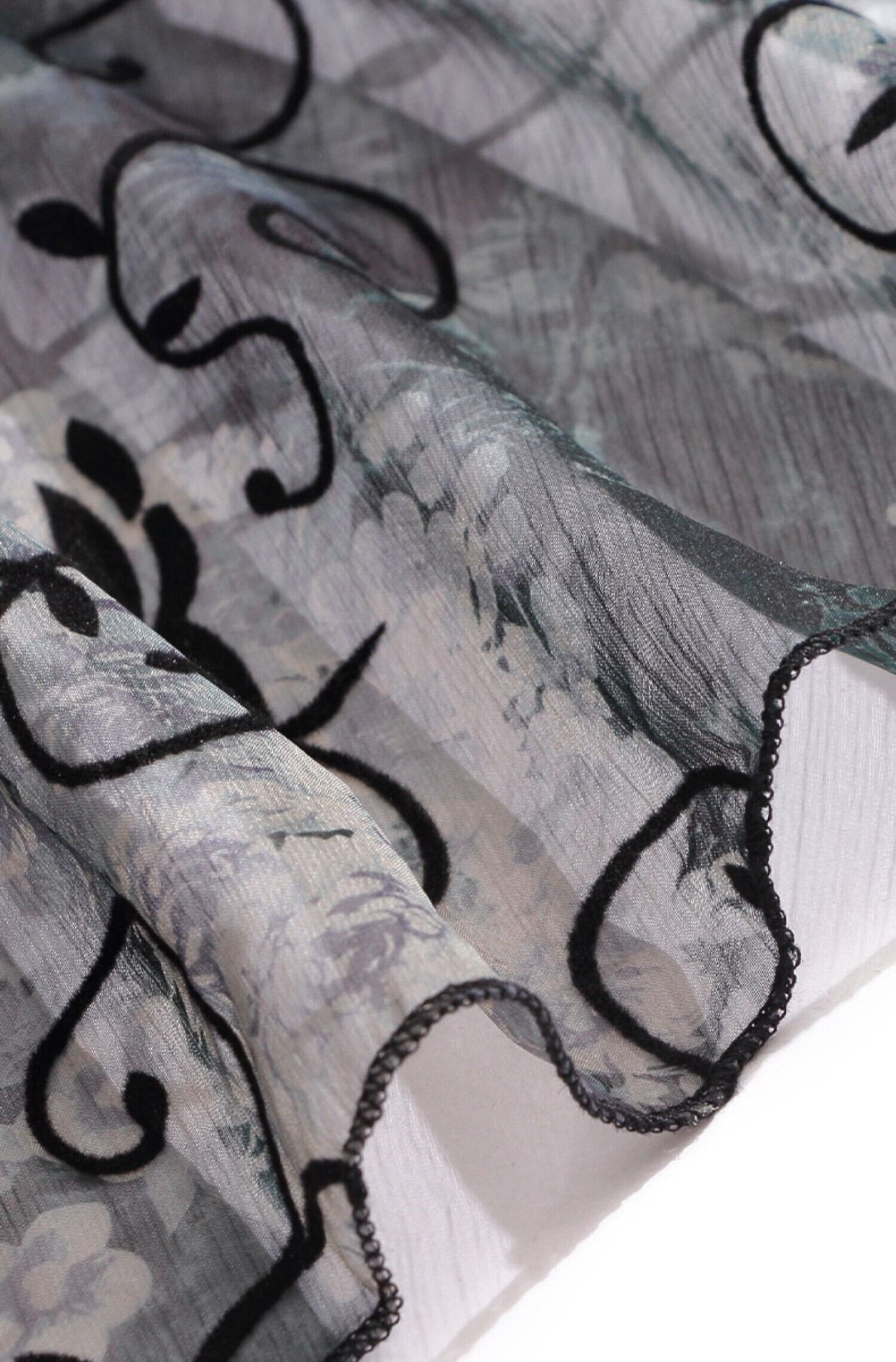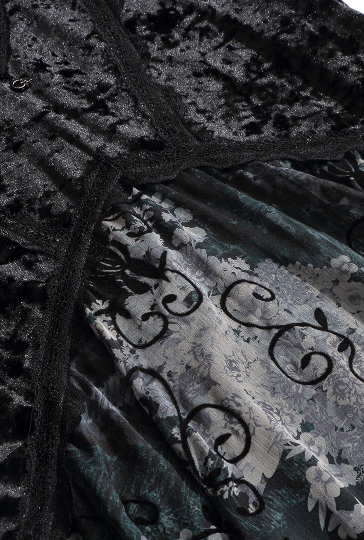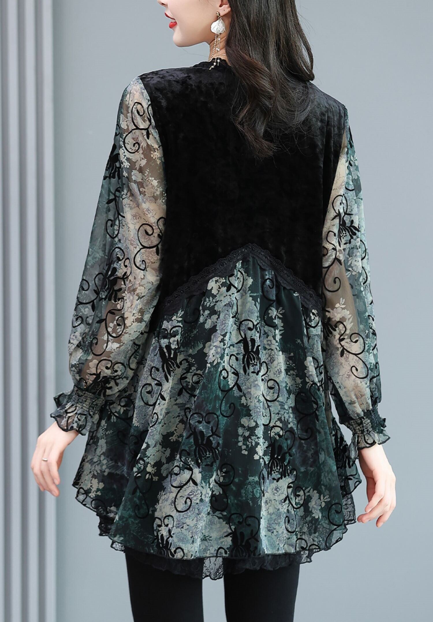 身頃の上半身部分をベルベット生地で切り替えた異素材MIXデザインがおしゃれなフラワー柄ブラウス。