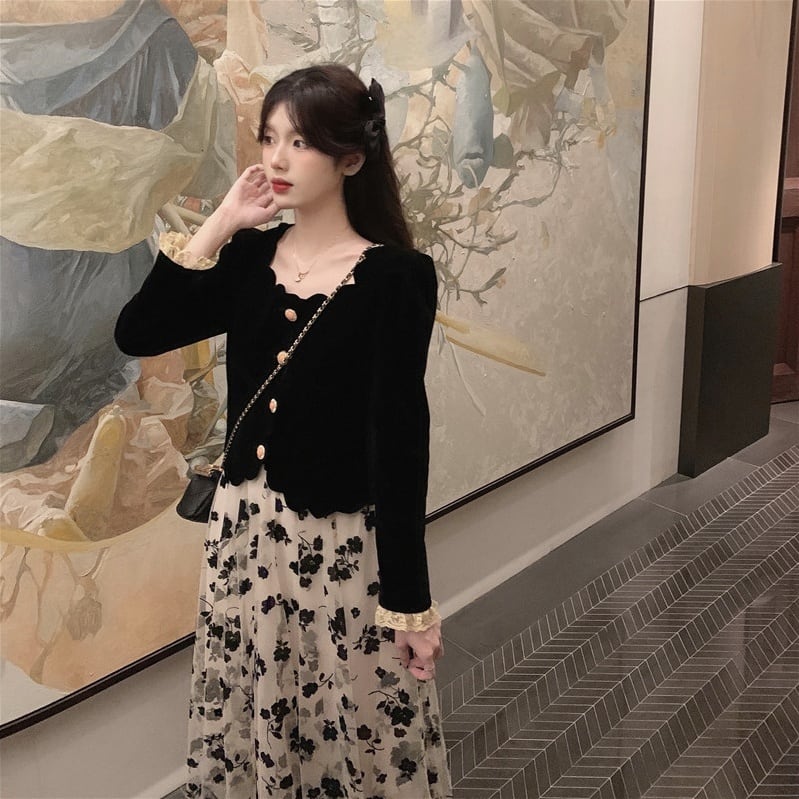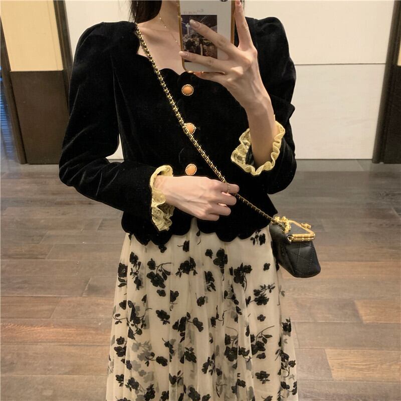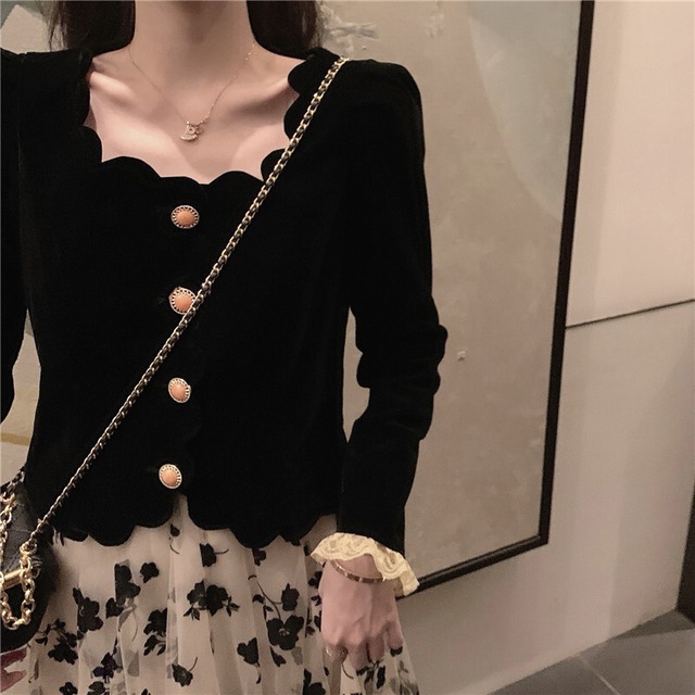 トップス カーディガン ショート丈 袖あり 長袖 スクエアネック スカラップデザイン 襟なし スリム 細身 レース フリル ゴールドボタン かわいい 大人可愛い きれいめ シンプル カジュアル 大人 上品 お洒落 大人女子 こなれ感 ガーリー 主役級 とろみ感 抜け感 無地 春 秋 冬 20代 30代 40代 ママ 通勤 学生 通学 デート お出かけ 女子会 休日 旅行 着回し 普段使い 重ね着 韓国系 オルチャン モテ 定番 トレンド 流行 インスタ映え S M L XL ブラック