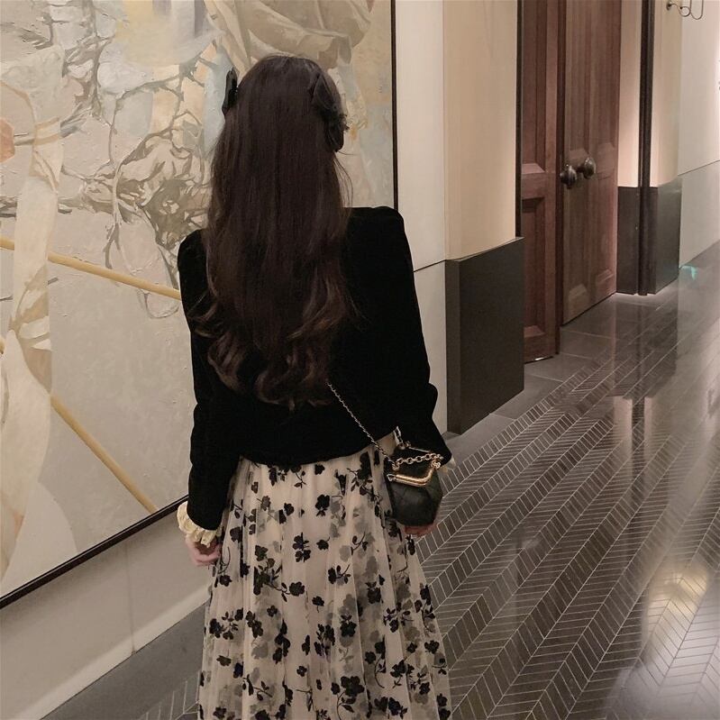 フロントのゴールドボタンがアクセントに。ショート丈でスタイルアップ効果も期待できそう。