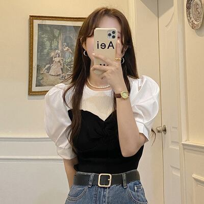 トップス レギュラー丈 半袖 パフスリーブ レギュラー袖 ラウンドネック スリム 薄手 フェイクツーピース かわいい 大人可愛い カジュアル お洒落 レトロ こなれ感 キュート 個性的 存在感 とろみ感 甘い シック 無地 夏 誕生日 10代 20代 レディース OL 学生 通学 デート お出かけ 女子会 お泊まり 休日 アウトドア イベント リゾート 旅行 海 高原 ホテル ガーデン レストラン ショッピング コーデ スタイル モテ プレゼント インスタ映え フランス S M L XL 黒 青