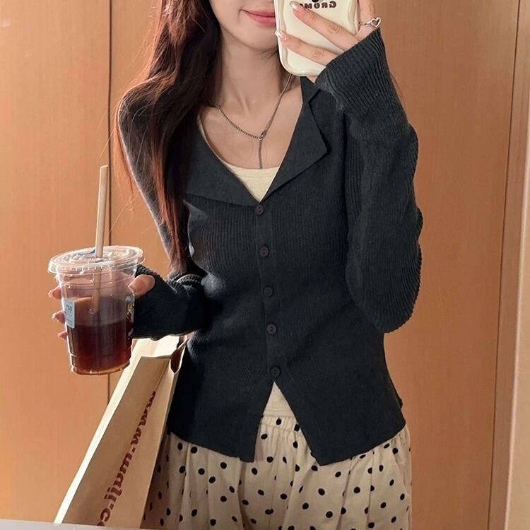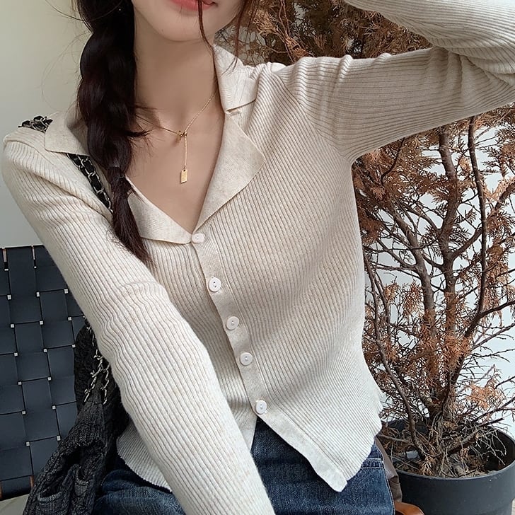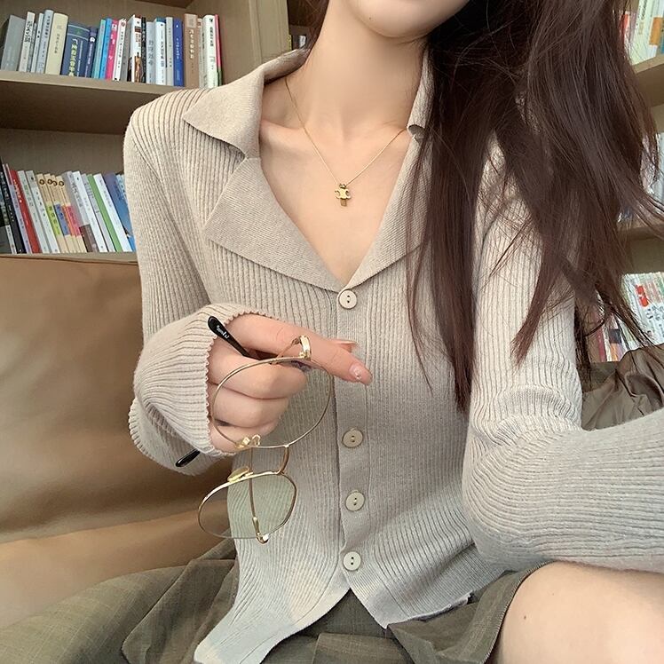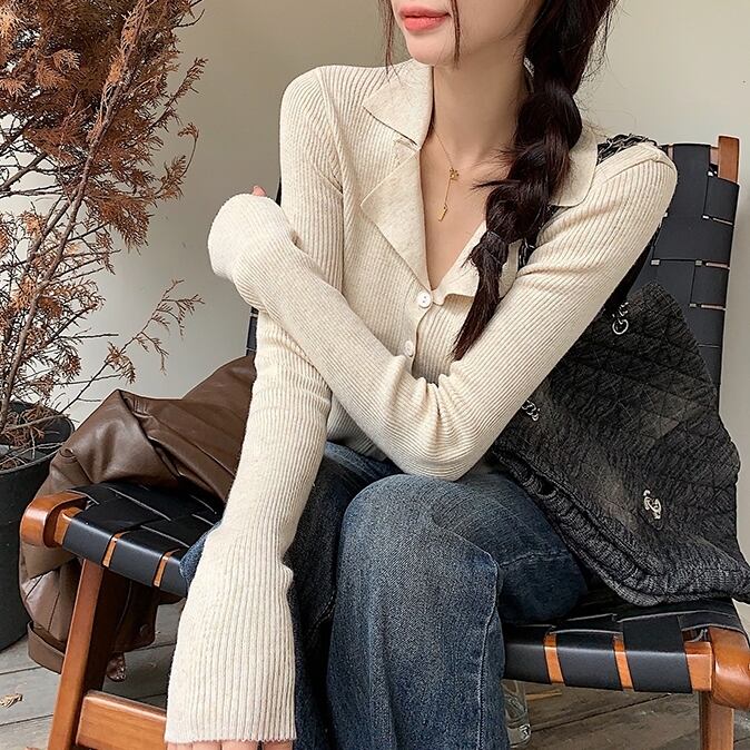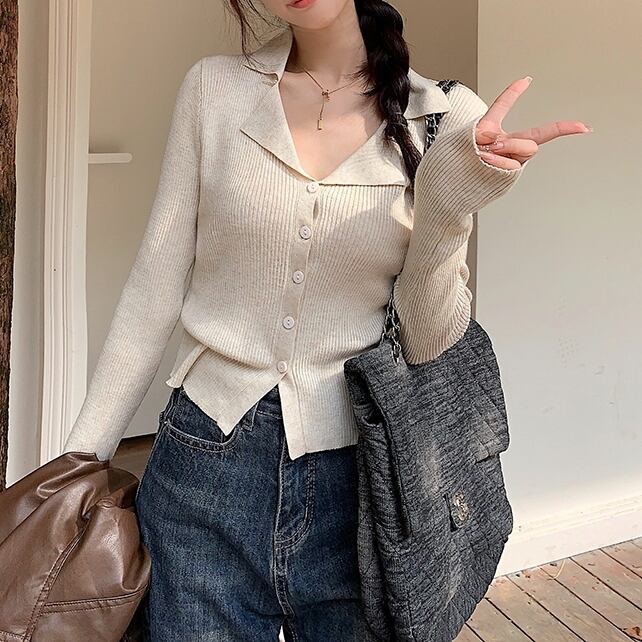 ポロカラーデザインがおしゃれなニットカーディガントップス。