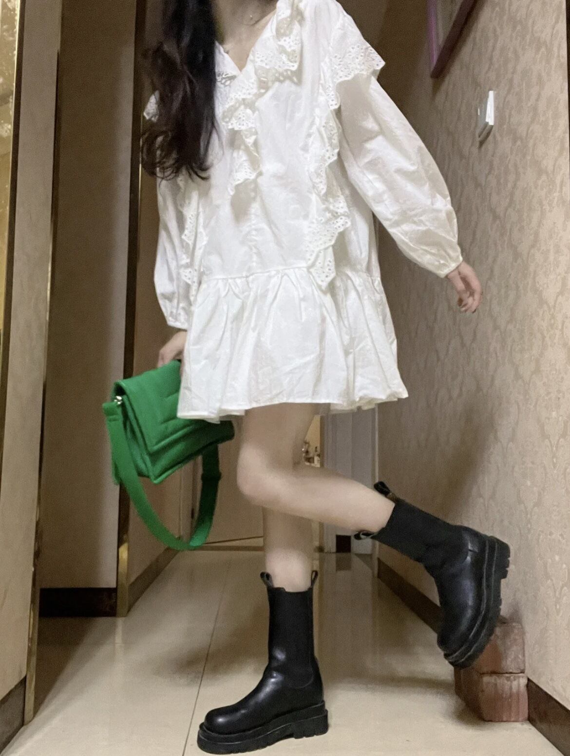 大ぶりのレースフリルをあしらったシフォンブラウス風のシャツワンピース。