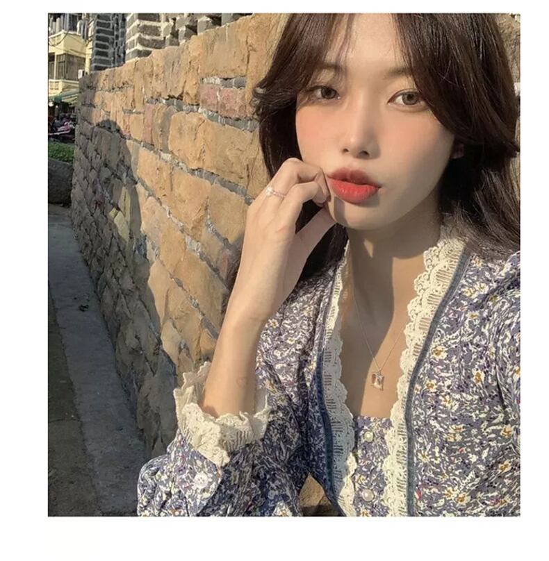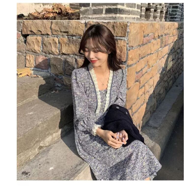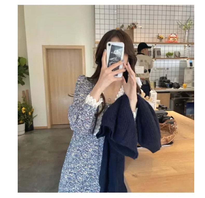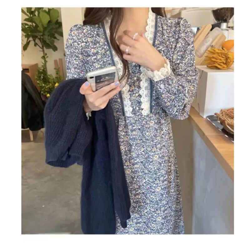 ワンピース レディース シフォン シャツワンピ ミモレ丈 花柄 膝下丈 レース スクエアネック くるみボタン Aライン メロウ セミフレア 長袖 襟付き スマート リブ 伸縮性 シンプル カジュアル きれいめ 上品 おしゃれ お洒落 大人っぽい 春 秋 冬 女性用 ママ 女の子 OL 通勤 学生 通学 デート お出かけ 女子会 休日 普段使い 重ね着 着回し 韓国風 オルチャン S M L ぽっちゃり マシュマロ女子 ブルー カラバリ