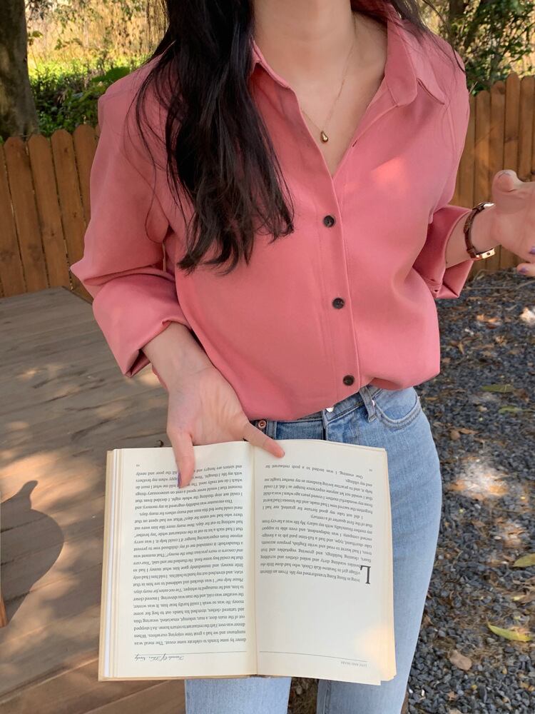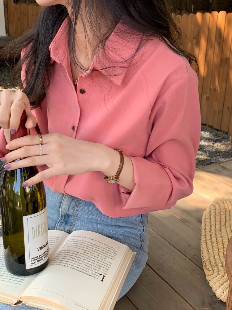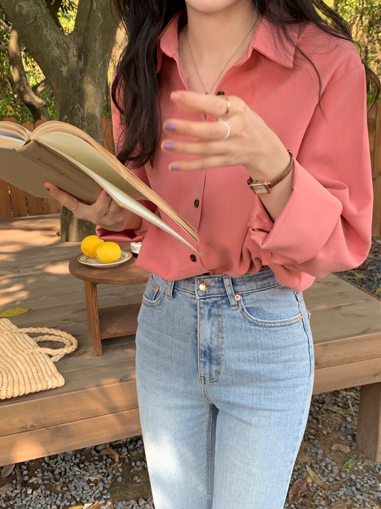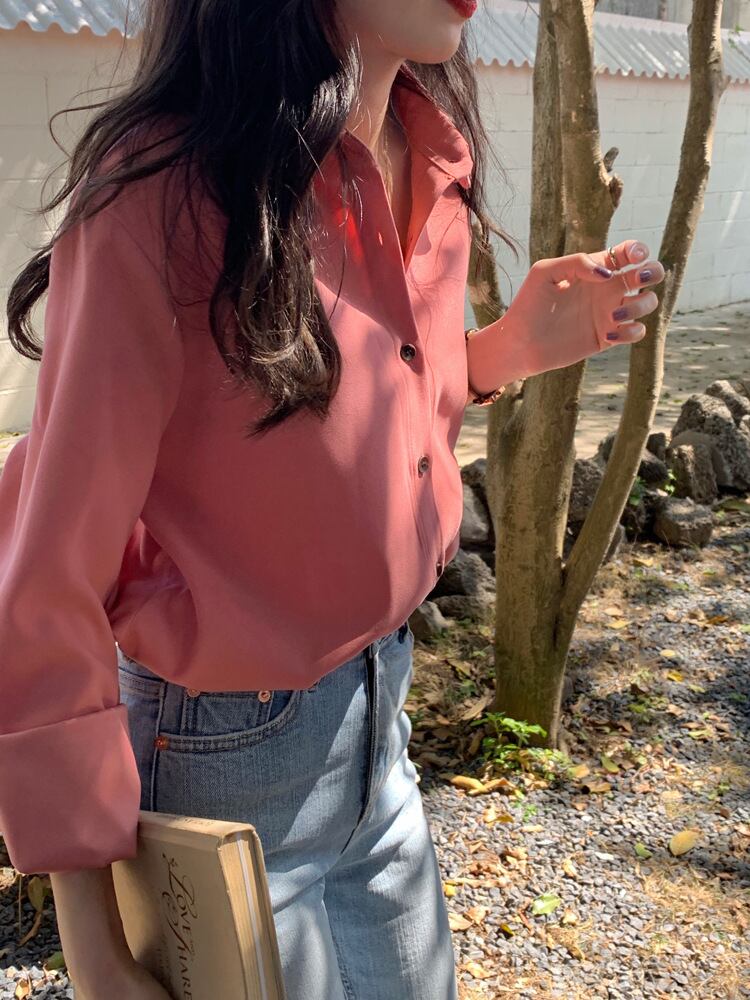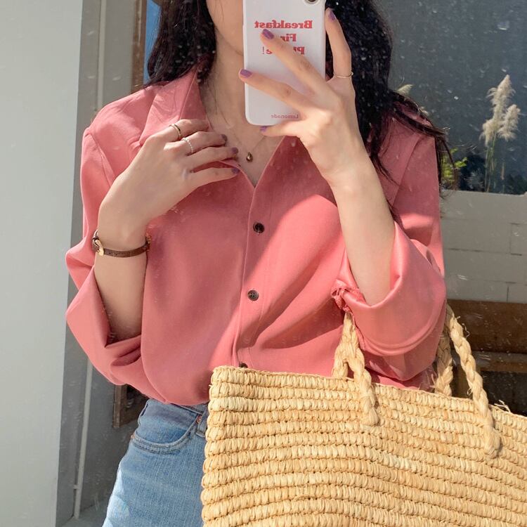 ボリュームのある袖がガーリーかつフェミニンなラズベリーピンクのシャツ。