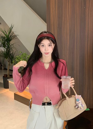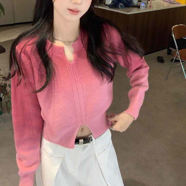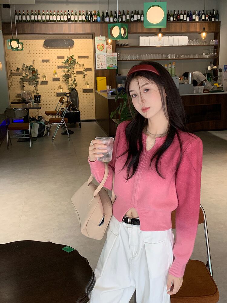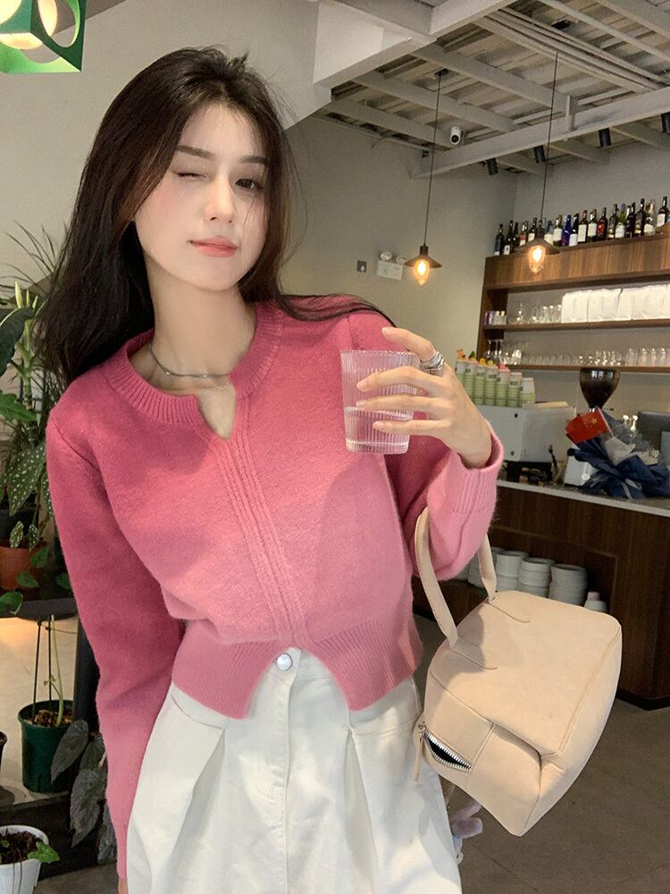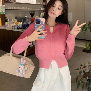ニット トップス クロップド キーネック レディース ショート丈 長袖 グラデーション スリット ワイド セーター 大人可愛い きれいめ 上品 エレガント ガーリー キュート レトロ マニッシュ ルーズ 大人女子 おしゃれ シンプル カジュアル 春 夏 秋 冬 二次会 オフィス 通勤 学生 通学 デート お出かけ パーティー イベント 女子会 体型カバー 普段使い 定番 トレンド ゆったり インスタ映え M L XL 2XL 3XL イエロー キャメル ピンク