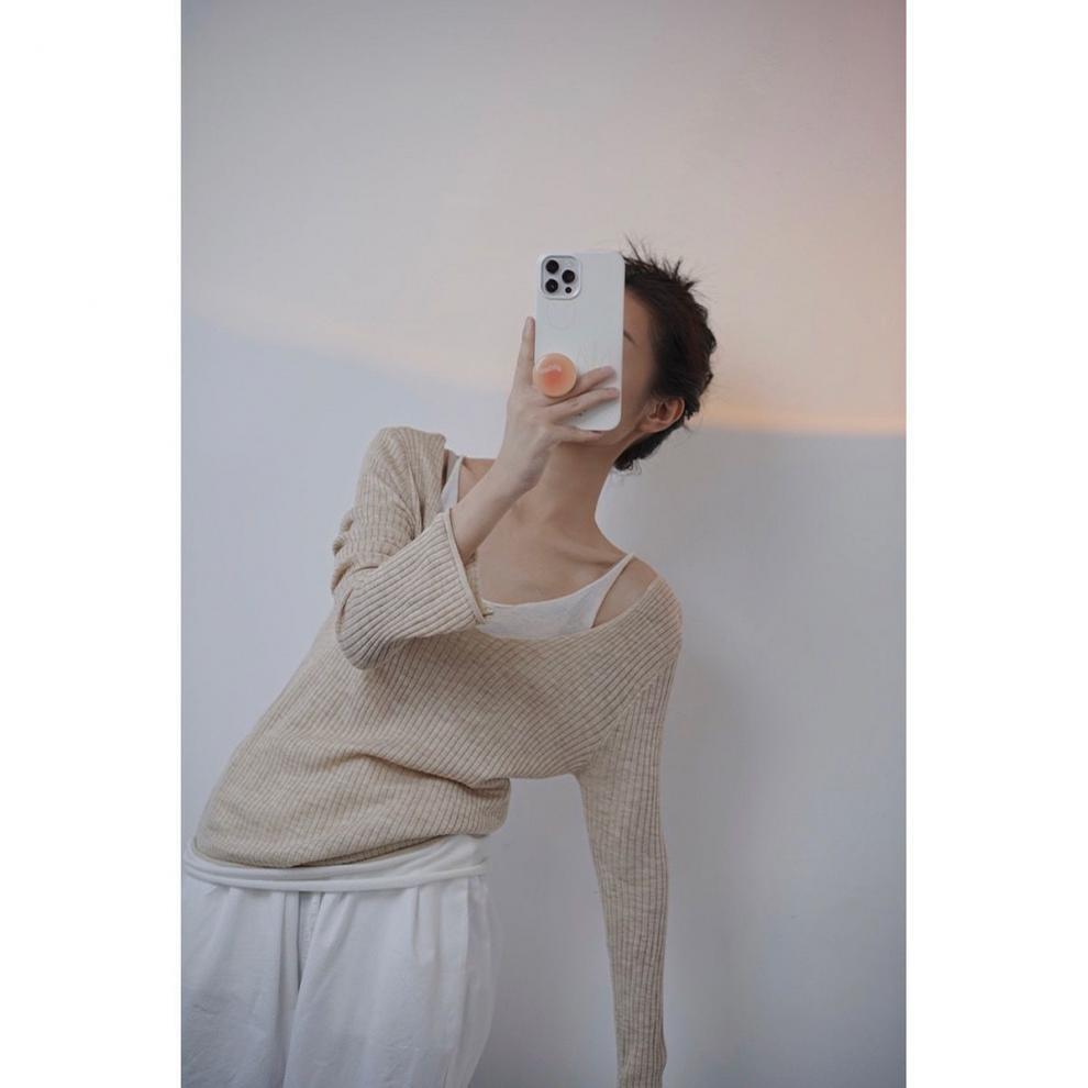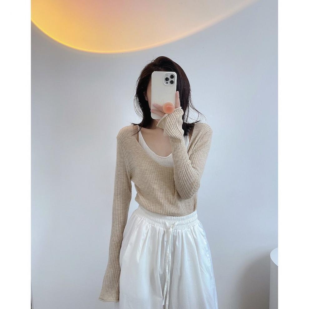 薄手キャミソールとニットソーをレイヤードしたようなフェイクレイヤードトップす。