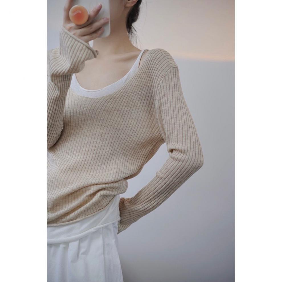 ニット トップス ラウンドネック レディース フェイクレイヤード 切り替え リブ タイト 刺繍 ワンポイント 長袖 セーター 大人可愛い きれいめ 上品 エレガント ガーリー キュート レトロ マニッシュ ルーズ 大人女子 おしゃれ シンプル カジュアル 春 夏 秋 冬 二次会 オフィス 通勤 学生 通学 デート お出かけ パーティー イベント 女子会 体型カバー 普段使い 定番 トレンド ゆったり インスタ映え ワンサイズ アプリコット