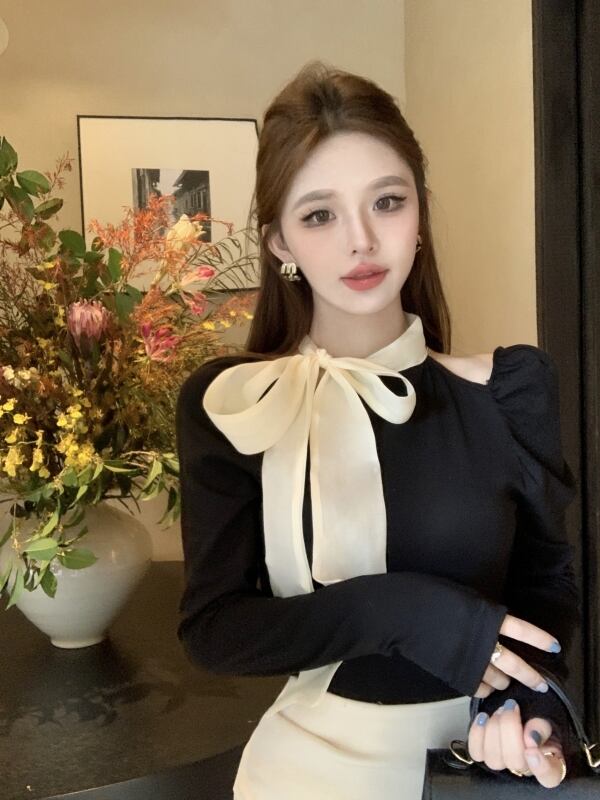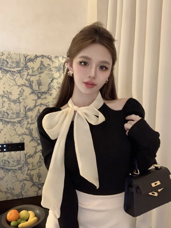 ニットソー トップス デート カットソー シフォン カットアウト 2WAY オフショルダー ホルターネック パワーショルダー 袖あり シフォン ボウタイ リボン 長袖 かわいい 大人可愛い きれいめ シンプル カジュアル 大人 上品 おしゃれ お洒落 主役級 存在感 春 秋 10代 20代 30代 レディース 女性用 OL 学生 デート お出かけ 公園デビュー 女子会 休日 イベント 旅行 着回し 普段使い コーデ 楽ちん モテ インスタ映え ワンサイズ ブラック
