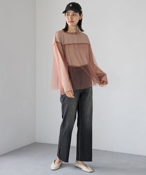 すっきりとしたノーカラーの襟元と透け感がセクシーで大人可愛い一枚です。