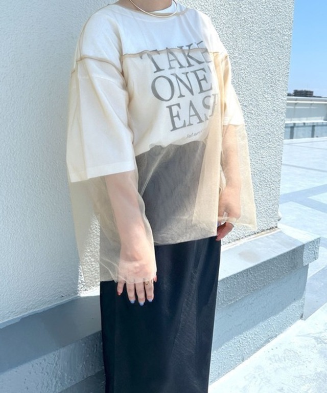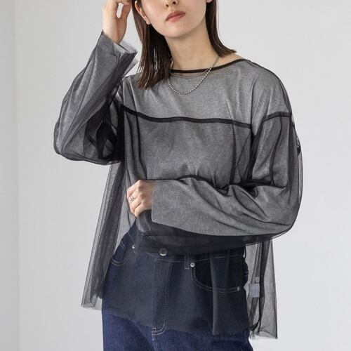パイピングラインが可愛いクルーネックのシアーフォンブラウスとTシャツのセット。