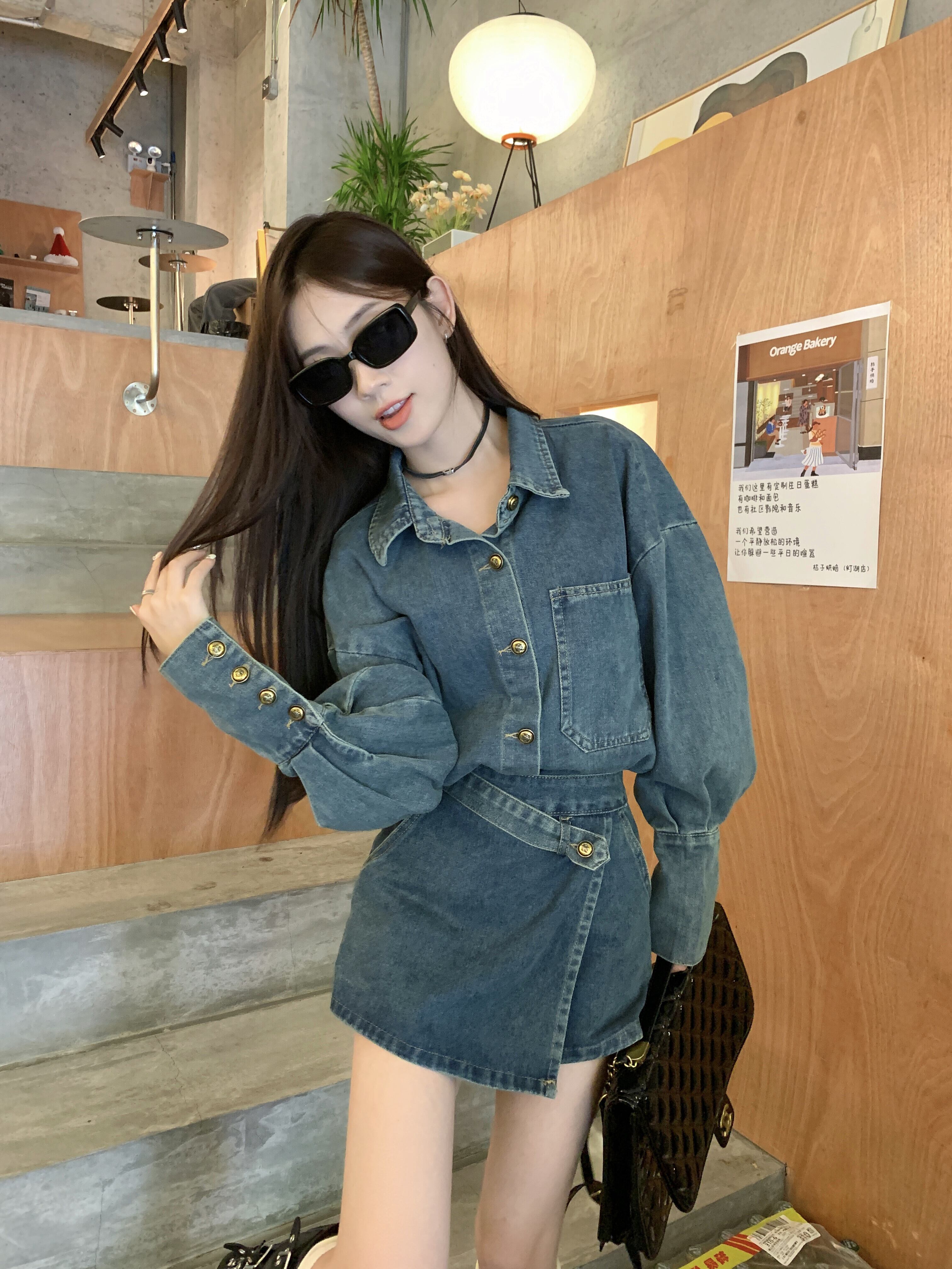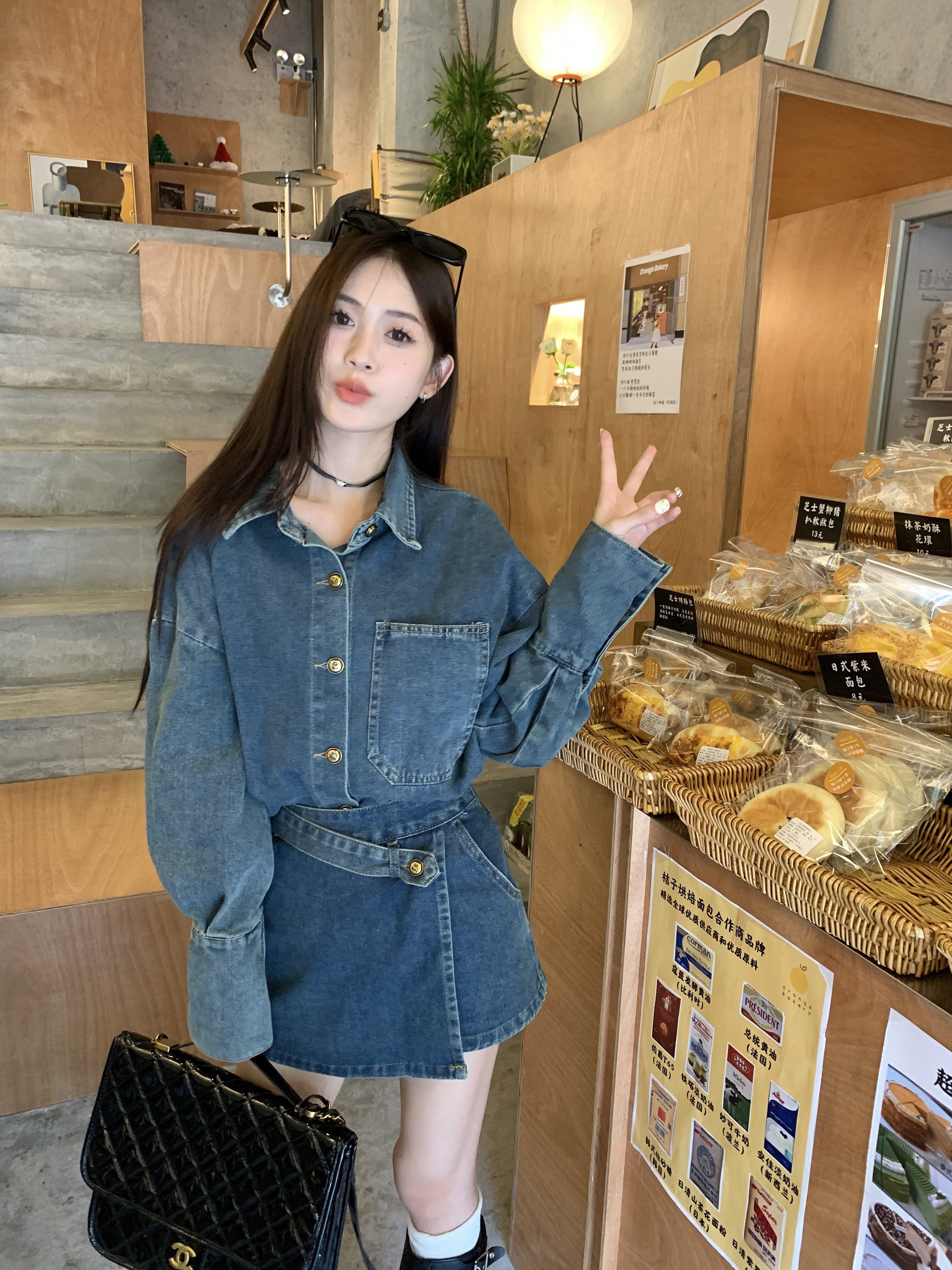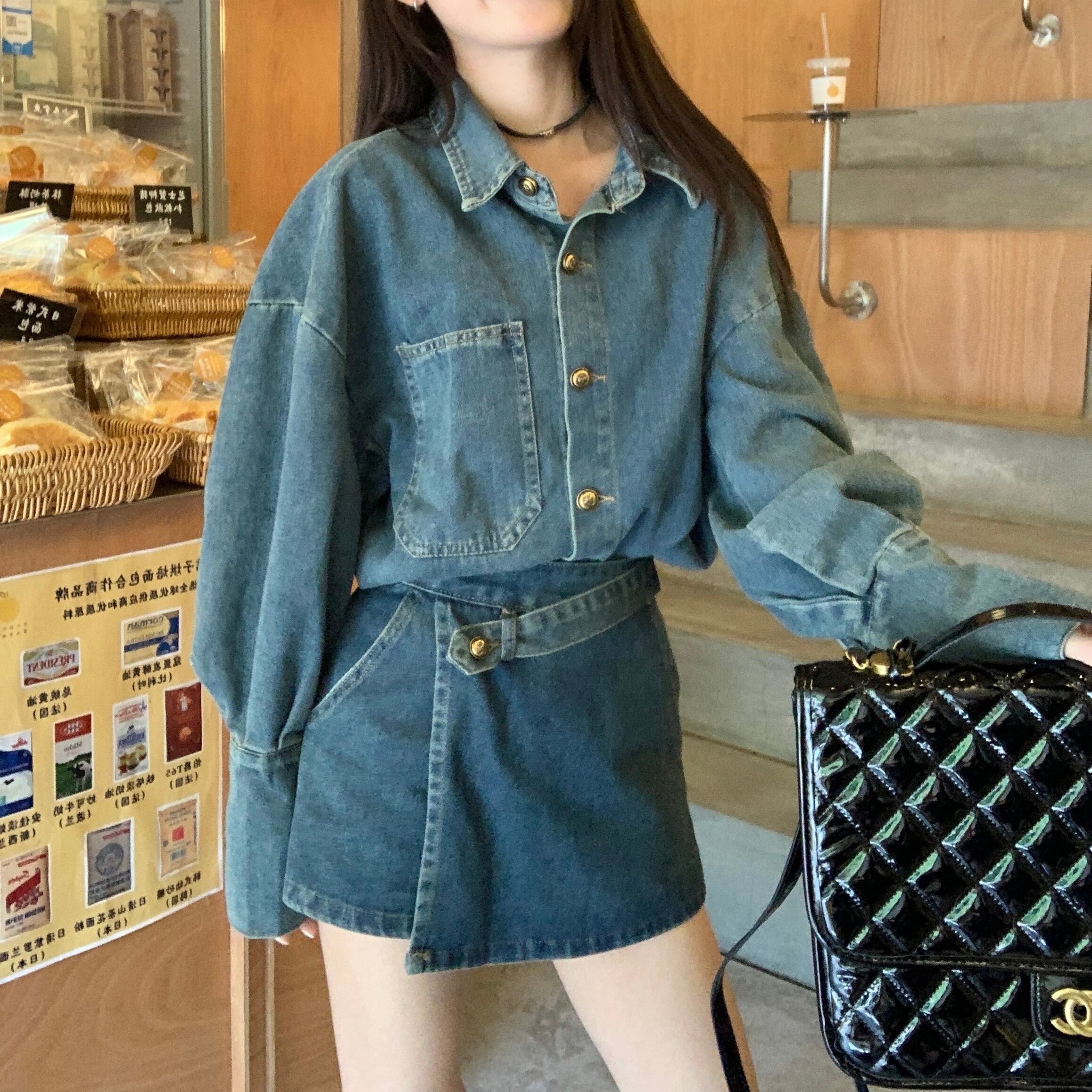 セットアップ ブラウス スカート ワンピース風 デート デニム ミニ ショート丈 ベルト 巻きスカート ラップスカート 袖あり かわいい 大人可愛い きれいめ シンプル カジュアル 大人 上品 おしゃれ お洒落 主役級 存在感 春 秋 10代 20代 30代 レディース 女性用 OL 学生 デート お出かけ 公園デビュー 女子会 休日 イベント 旅行 着回し 普段使い ファッション コーデ 楽ちん モテ トレンド 流行 インスタ映え S M L ビッグサイズ ゆったり ブルー