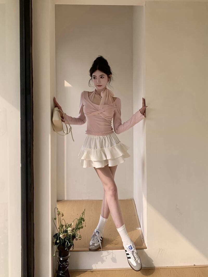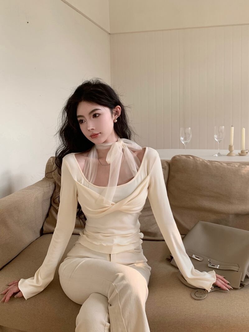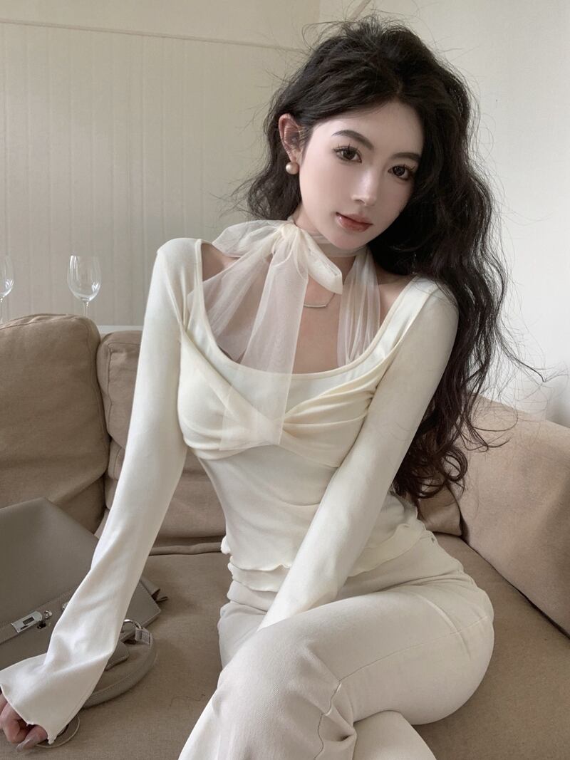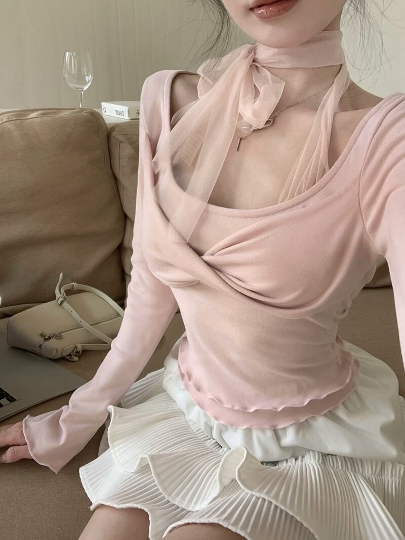 カットソー トップス デート フェイクレイヤード バイカラー ツートーン タイト 袖あり シフォン ボウタイ リボン 長袖 かわいい 大人可愛い きれいめ シンプル カジュアル 大人 上品 おしゃれ お洒落 主役級 存在感 春 秋 冬 10代 20代 30代 レディース 女性用 OL 学生 デート お出かけ 公園デビュー 女子会 休日 イベント 旅行 着回し 普段使い コーデ 楽ちん モテ インスタ映え ワンサイズ アプリコット ピンク カーキ