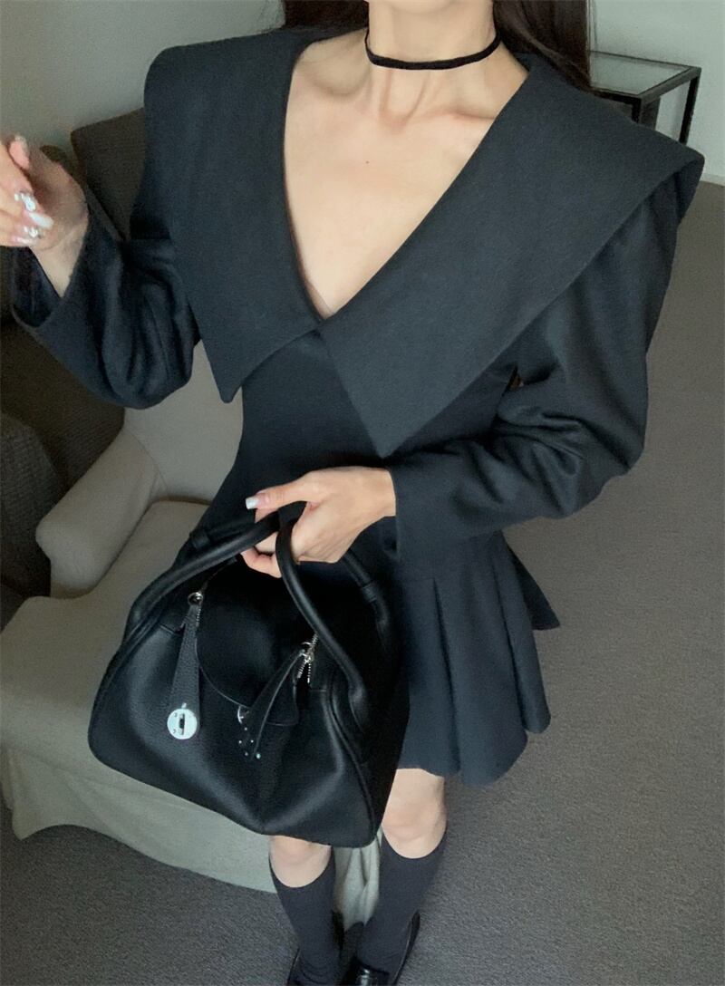 広めのVネックと大きな襟がドーリーな上品なスーツ風ミニワンピース。