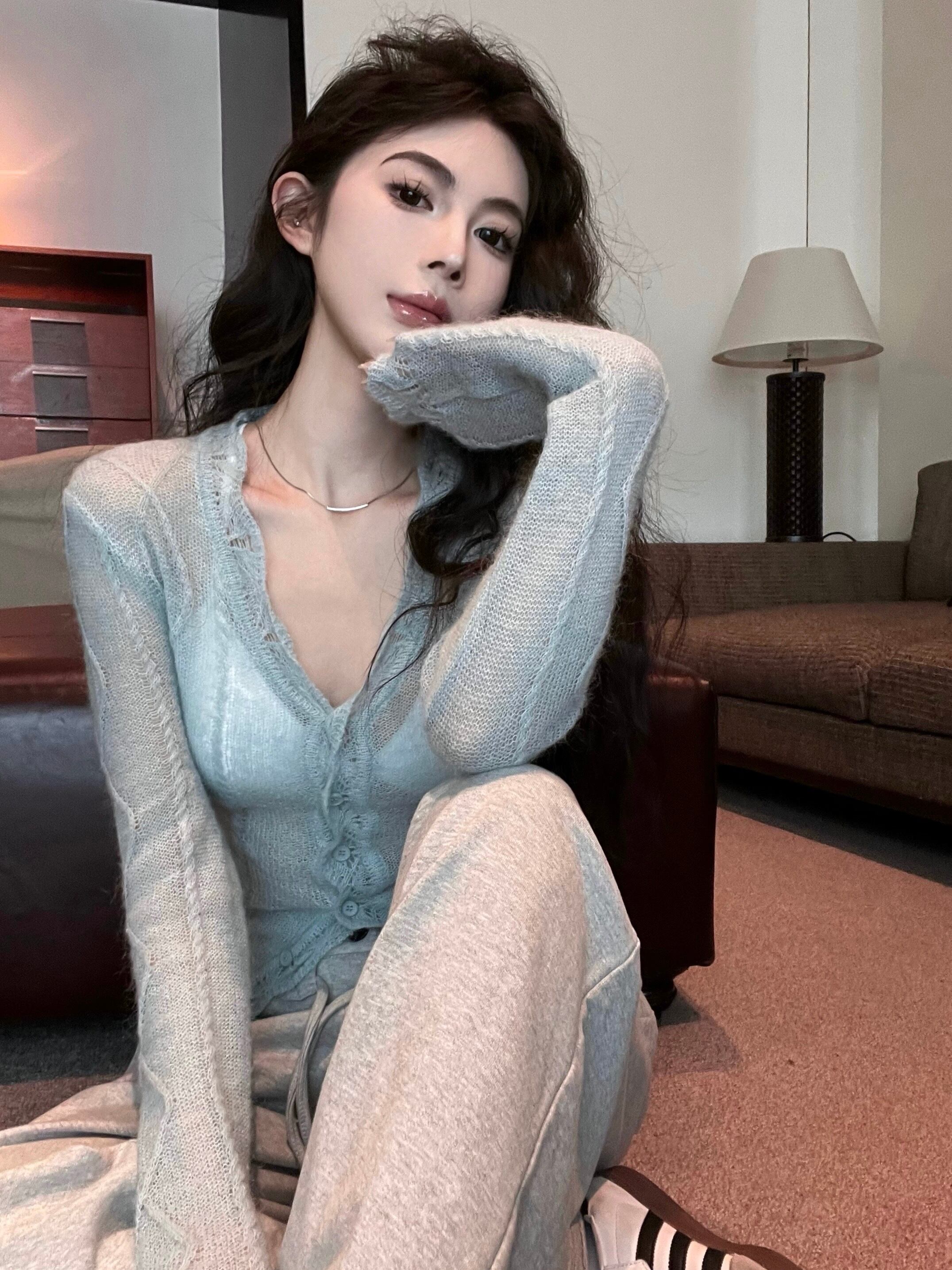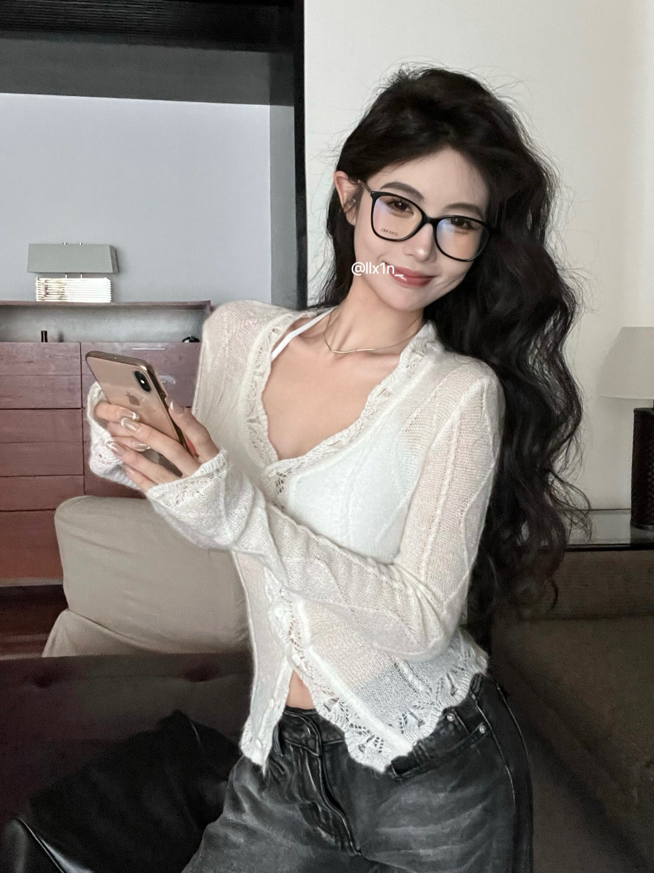 カットソー トップス 長袖 シアー ニット カーディガン レディース スカラップ 薄手 レース タイト Vネック 前開き 無地 シンプル きちんと感 可愛い キレイめ 上品 フェミニン カジュアル 春 夏 秋 冬 デイリー おでかけ 仕事 普段着 定番 スマート 細見え 軽やか ゆったり 体型カバー インスタ映え トレンド シャーベットカラー ホワイト グレー ブルー