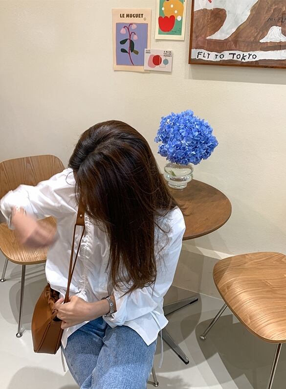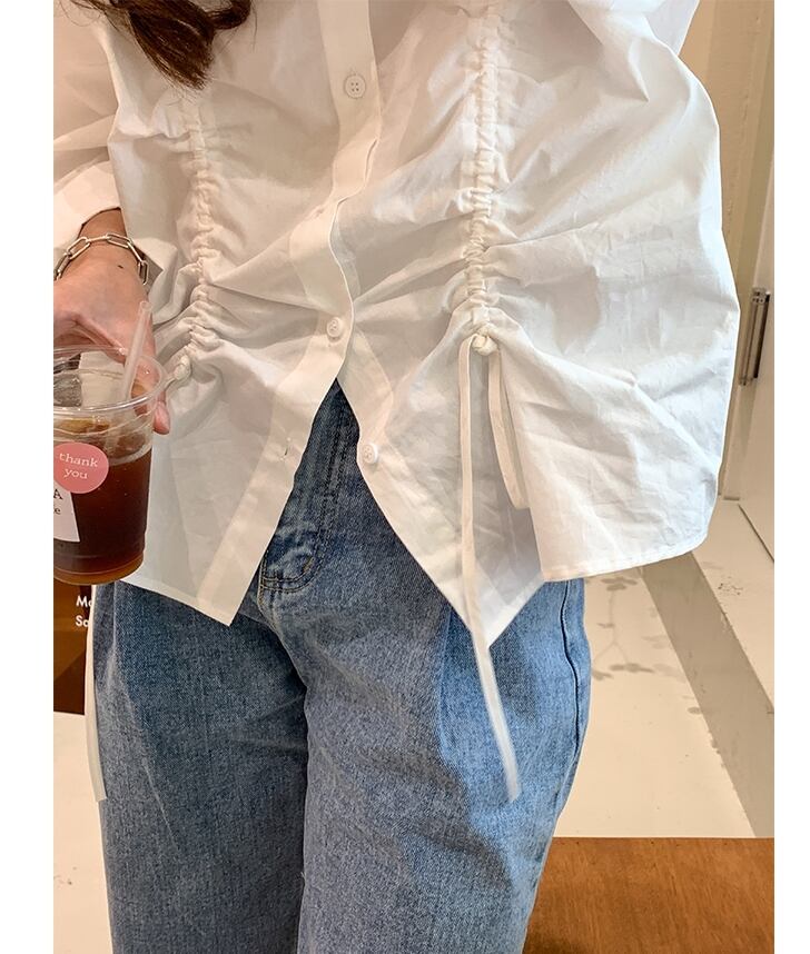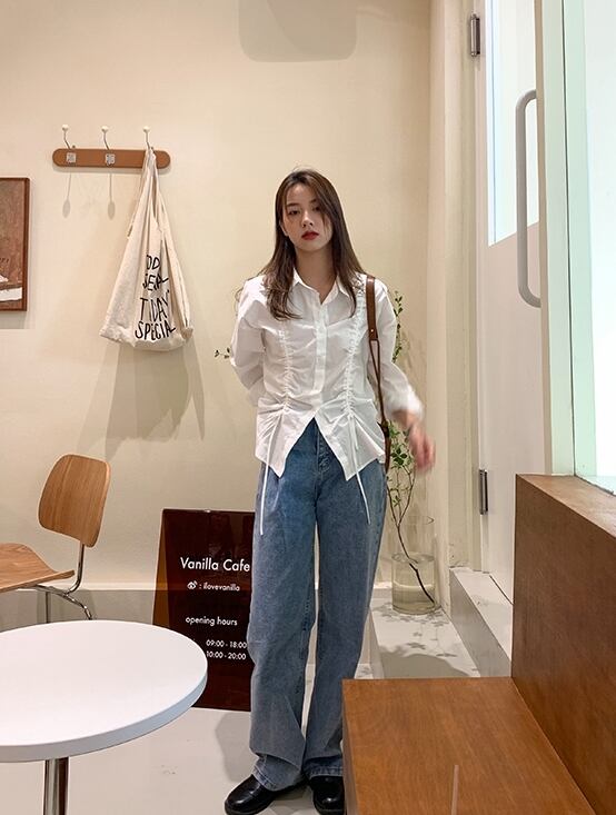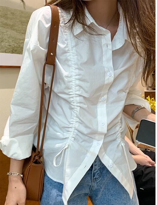 フロントのシャーリングで立体的なアレンジを楽しめるブラウスです。
