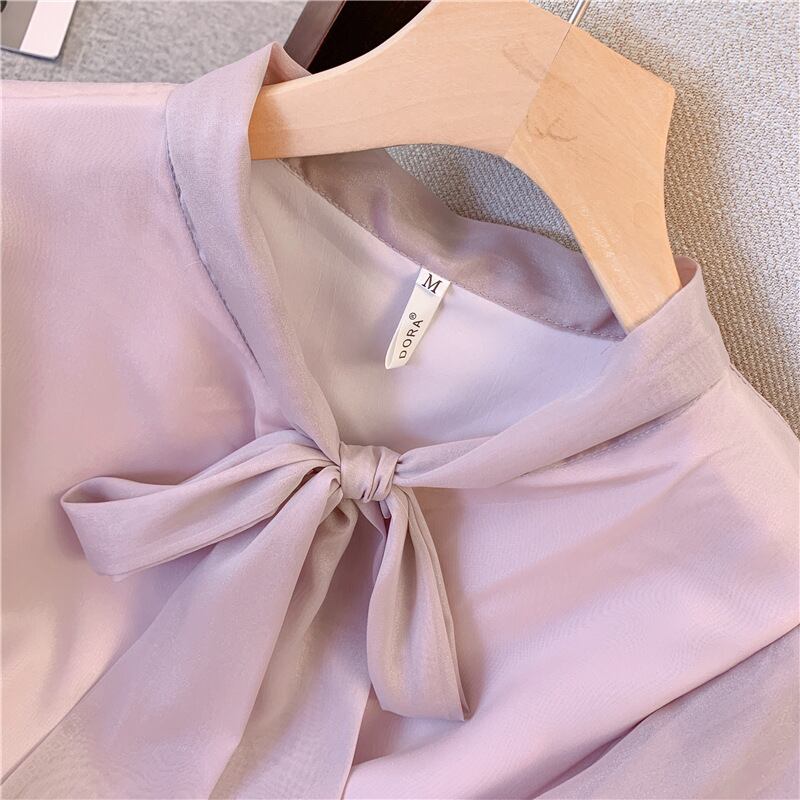 ボリューミーなリボン付きの襟元と、透け感がセクシーで大人可愛い一枚です。