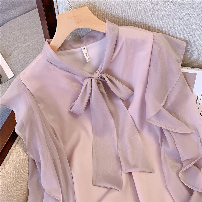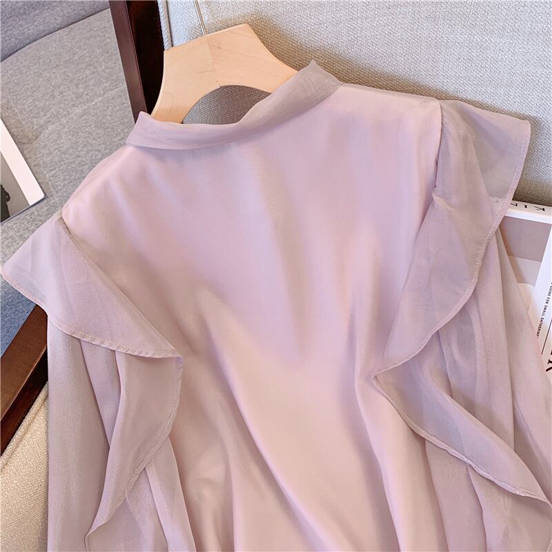 袖にあしらったフリルのボリューム感が可愛いシフォンブラウスです。
