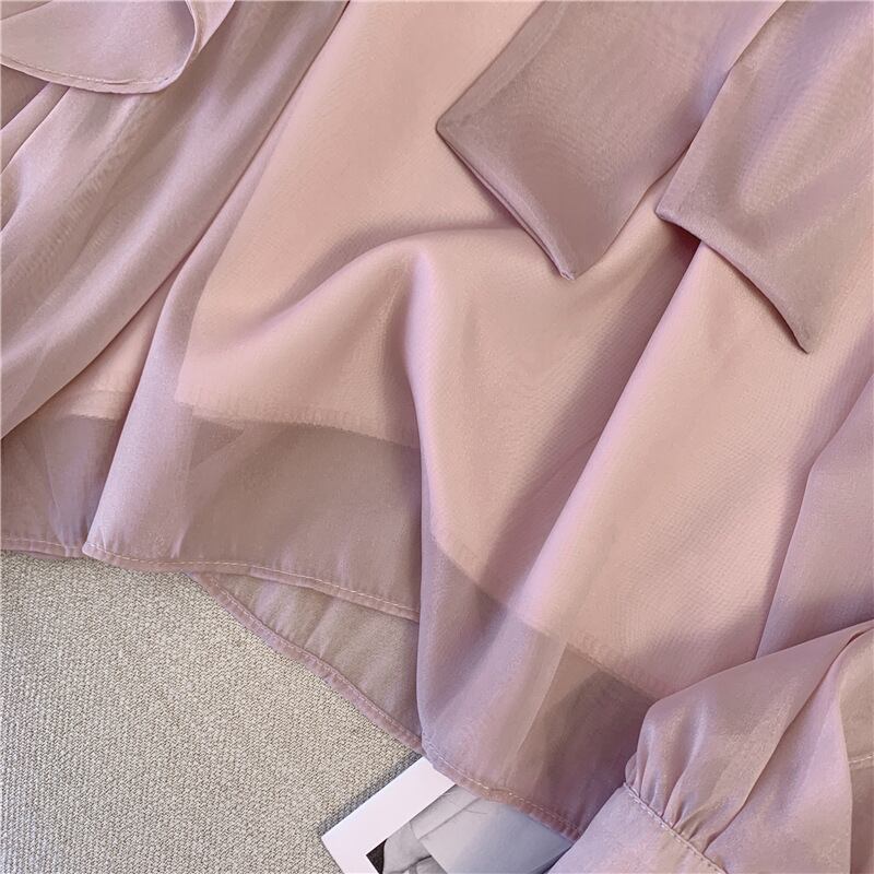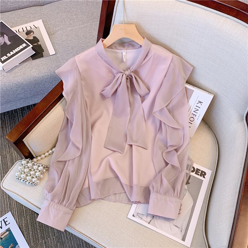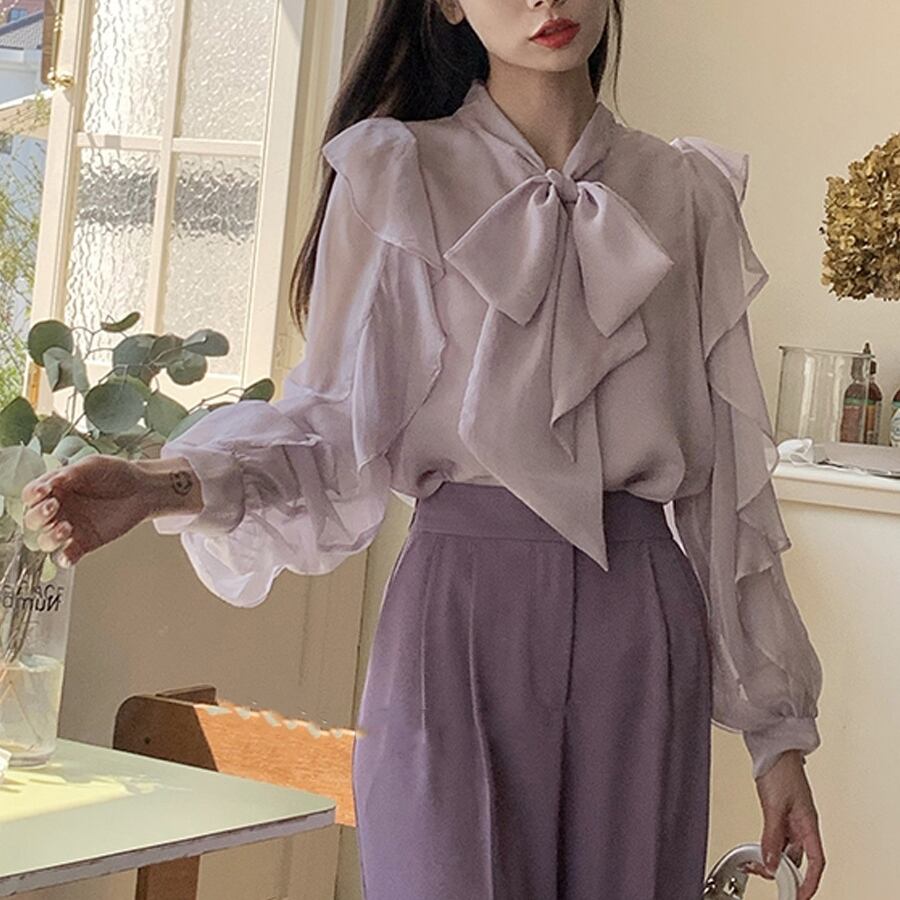 ブラウス トップス デート シャツ 袖あり ブラウス バルーンスリーブ フリル シフォン ボウタイ リボン付き スカーフ パフスリーブ 透け感 シアー 長袖 かわいい 大人可愛い きれいめ シンプル カジュアル 大人 上品 おしゃれ お洒落 主役級 存在感 春 秋 10代 20代 30代 レディース 女性用 OL 学生 デート お出かけ 公園デビュー 女子会 休日 イベント 旅行 着回し 普段使い コーデ 楽ちん モテ インスタ映え S M パープル