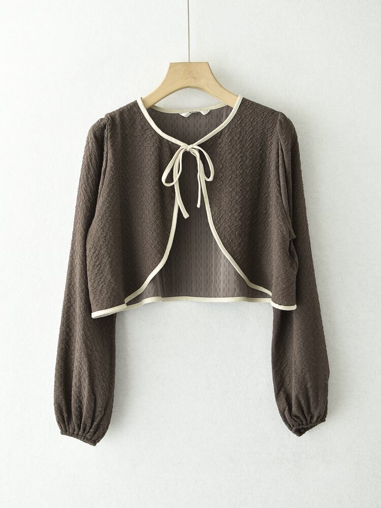 パイピングと襟元のリボンデザインがおしゃれなショート丈カーディガン。