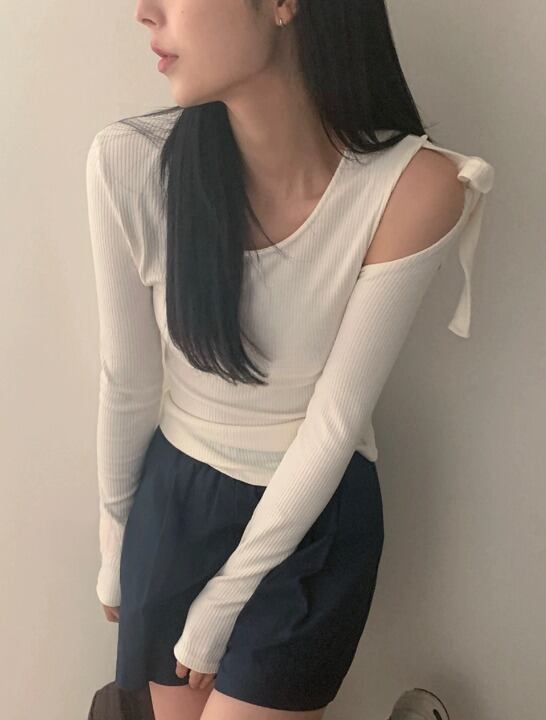アシンメトリーなリボン付きワンショルダーデザインの細めトップス。