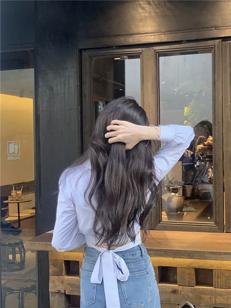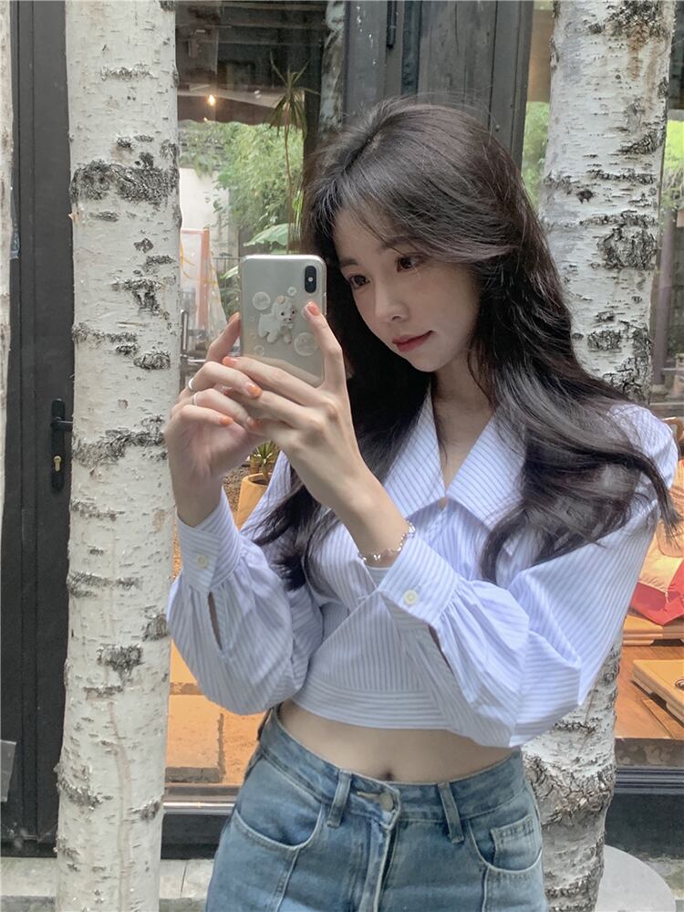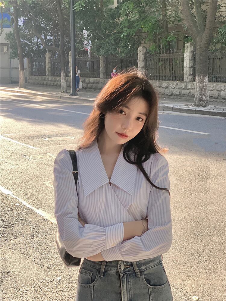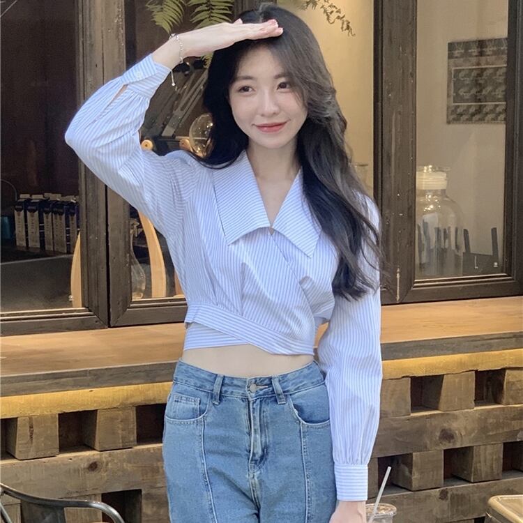 ブラウス トップス シャーリング カシュクール ストライプ ラージカラー タック Vネック レディース シャーリングシャツ パフスリーブ クロップ シャツ 長袖 フリル ガーリー オシャレ シンプル 可愛い キレイめ 上品 カジュアル 春 夏 秋 冬 デイリー おでかけ 公園コーデ アウトドア 普段着 王道 万能 ミニマム スマート コンパクト 細見え スタイルアップ 高見え 新鮮 上級者 主役級 鮮度アップ トレンド 動きやすい 軽やか ゆったり 体型カバー インスタ映え ブルー S M L
