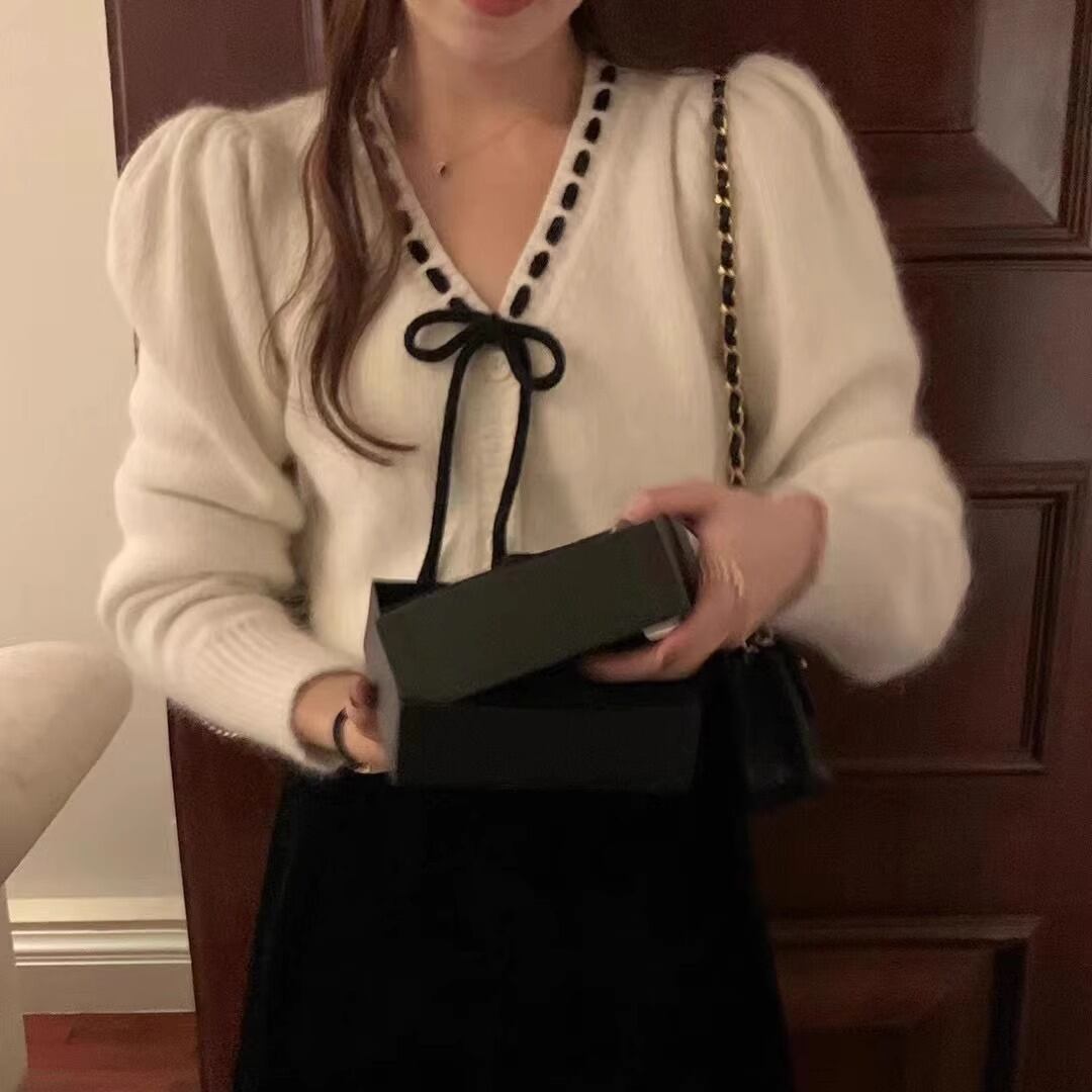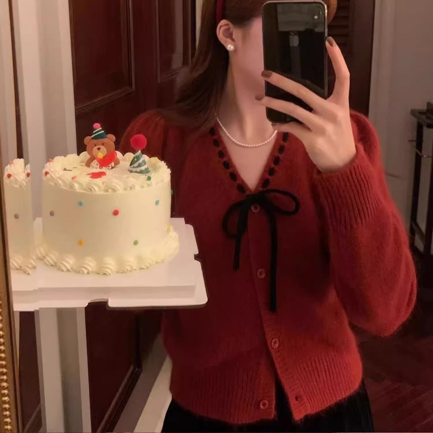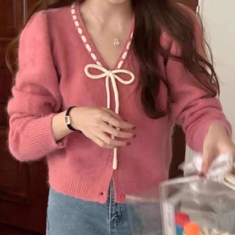 カーディガン ニット トップス ショート丈 Vネック レディースステッチ リボン バイカラー 切り替え パワーショルダー タック ボタン リボン 長袖 セーター 大人可愛い きれいめ 上品 エレガント ガーリー キュート レトロ マニッシュ ルーズ 大人女子 おしゃれ シンプル カジュアル 春 夏 秋 冬 二次会 オフィス 通勤 学生 通学 デート お出かけ パーティー イベント 女子会 体型カバー 普段使い 定番 トレンド ゆったり インスタ映え S M L レッド ホワイト ピンク ブラック