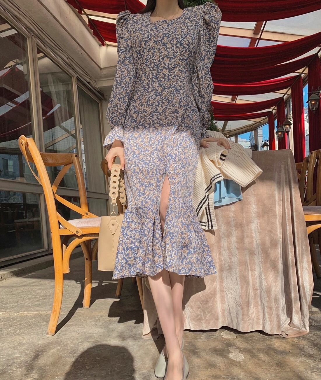淡い花柄とスリット入りのマーメイドスカートで上品な可愛らしさが漂うアイテム。
