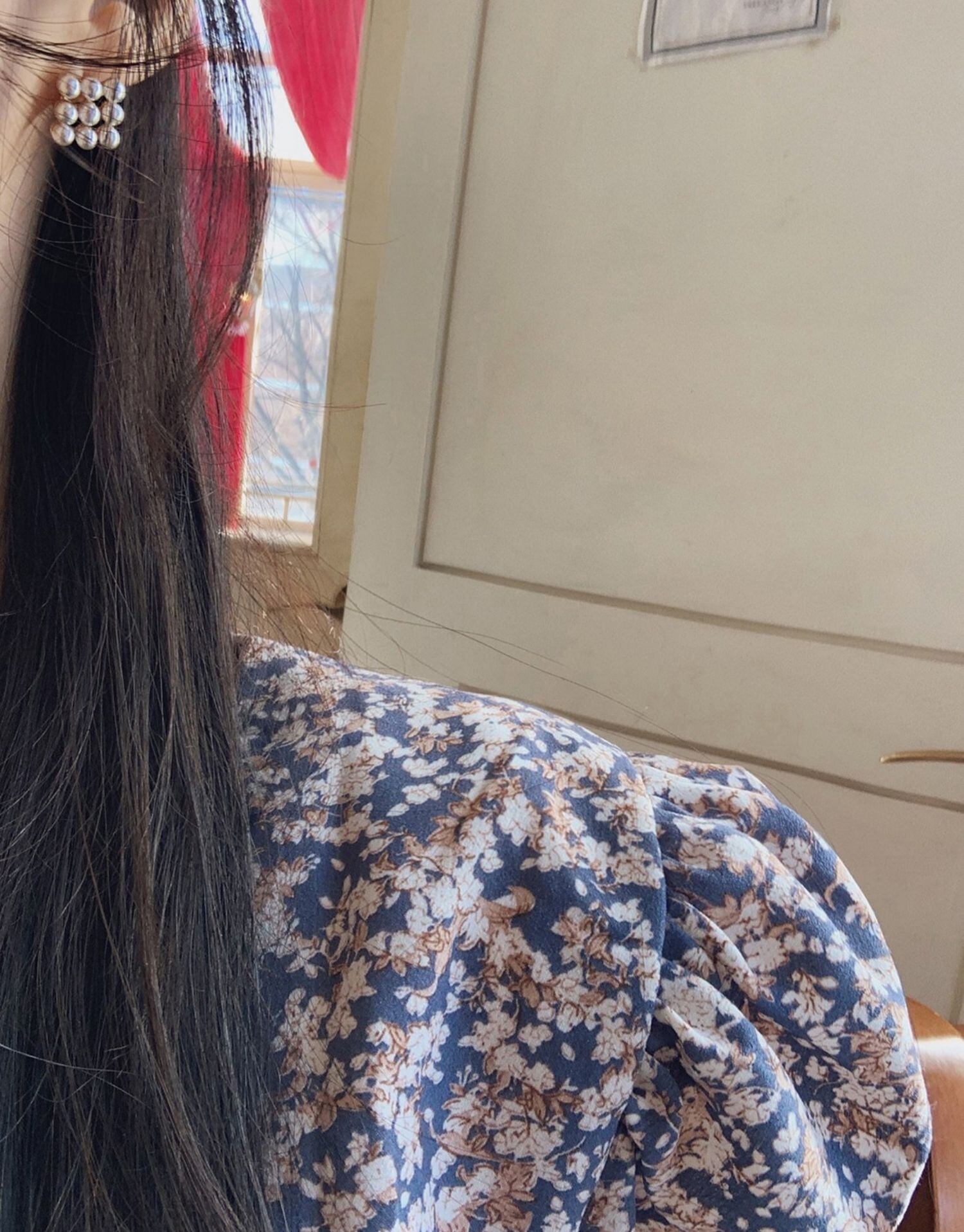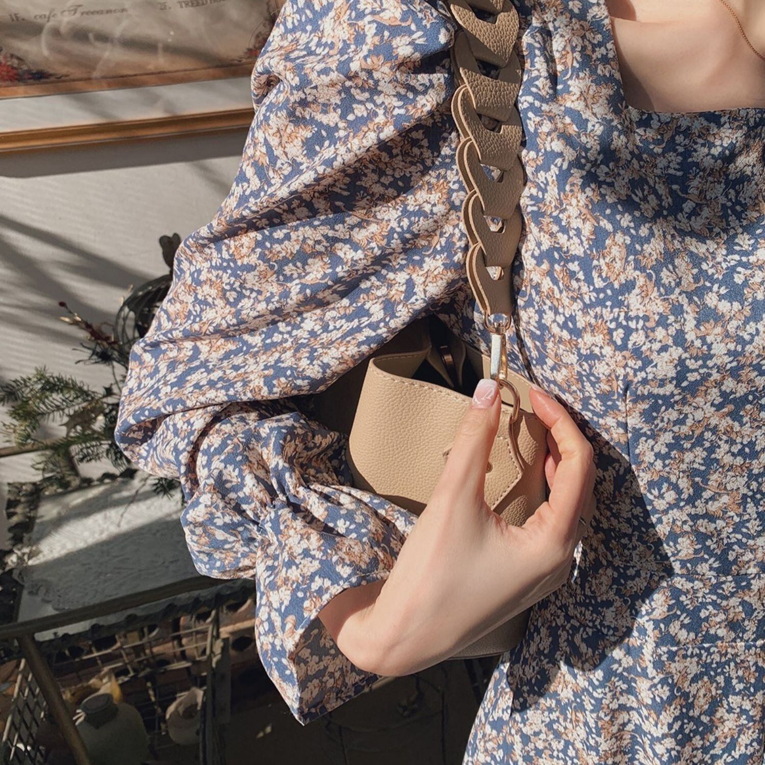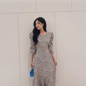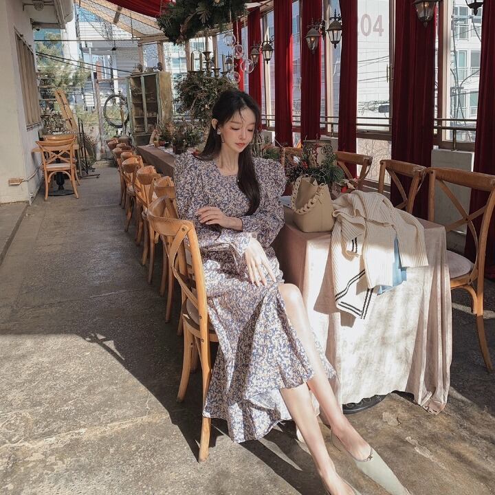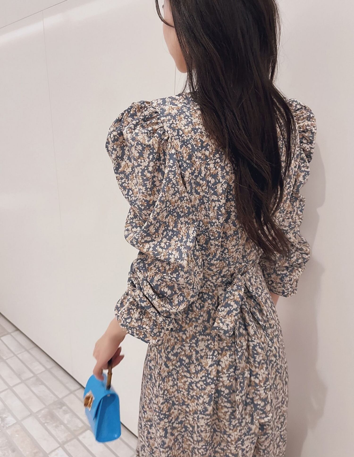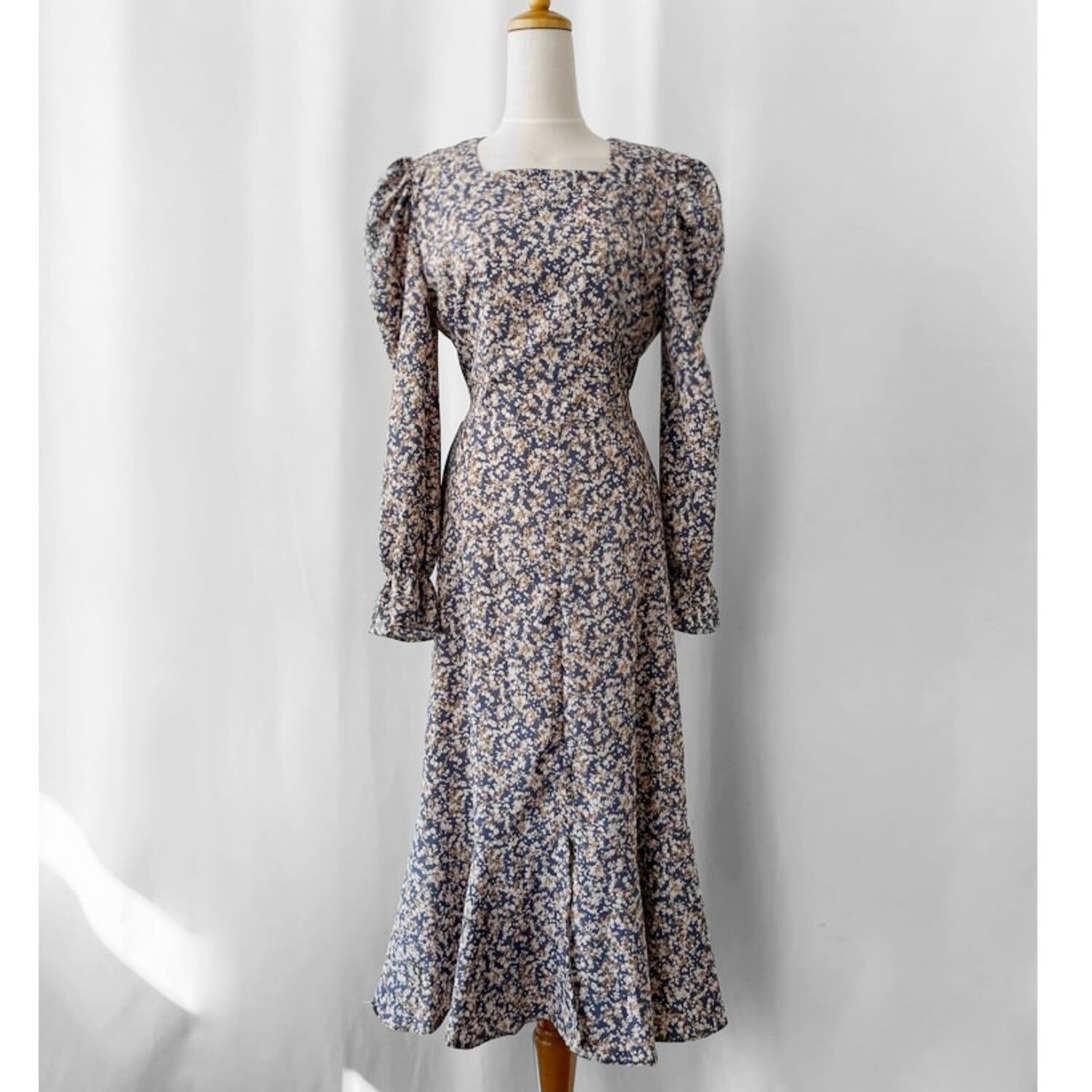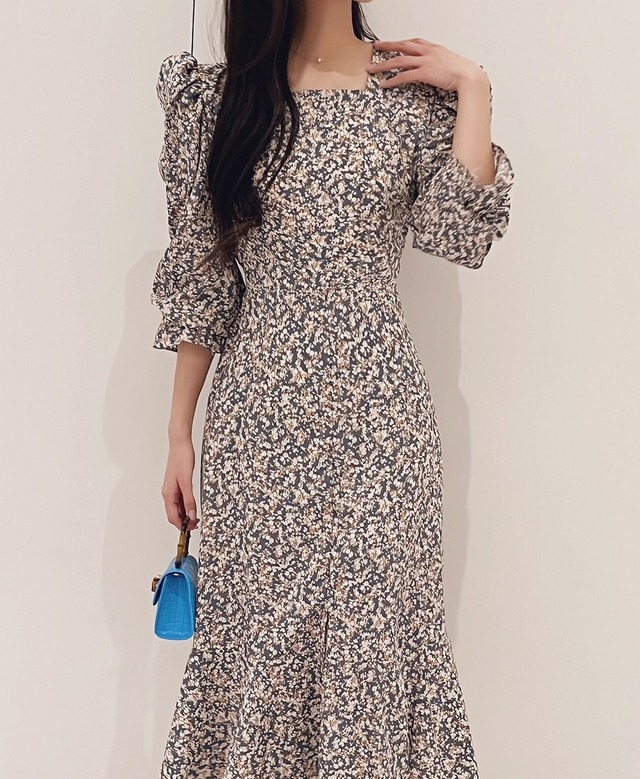 スクエアネックとパワーショルダーがおしゃれな花柄ミモレ丈ワンピースです。
