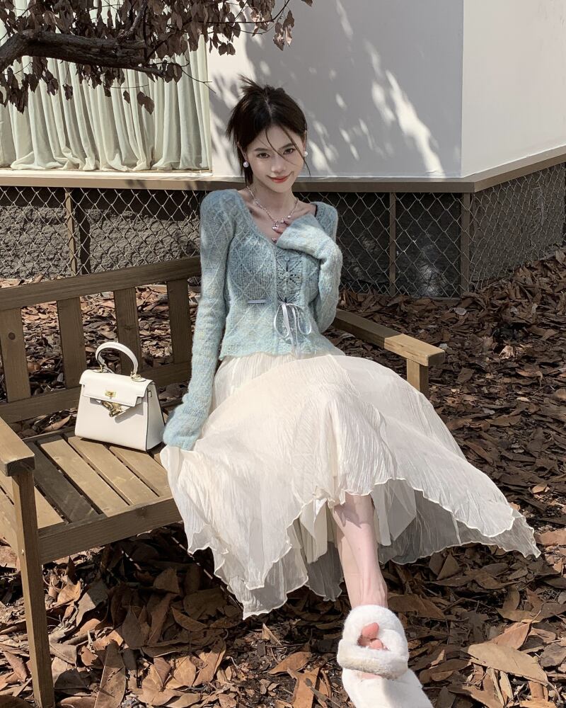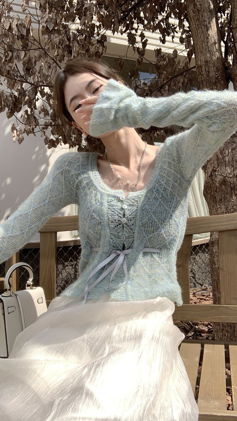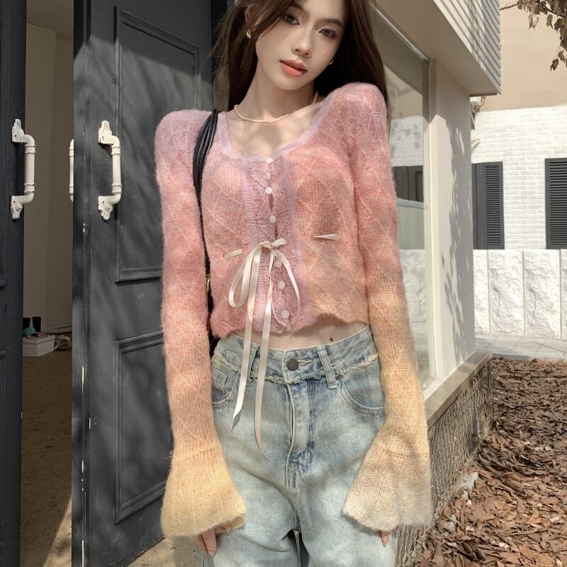 淡いグラデーション糸で編んだ繊細なリボン付きエレガントニットソー。
