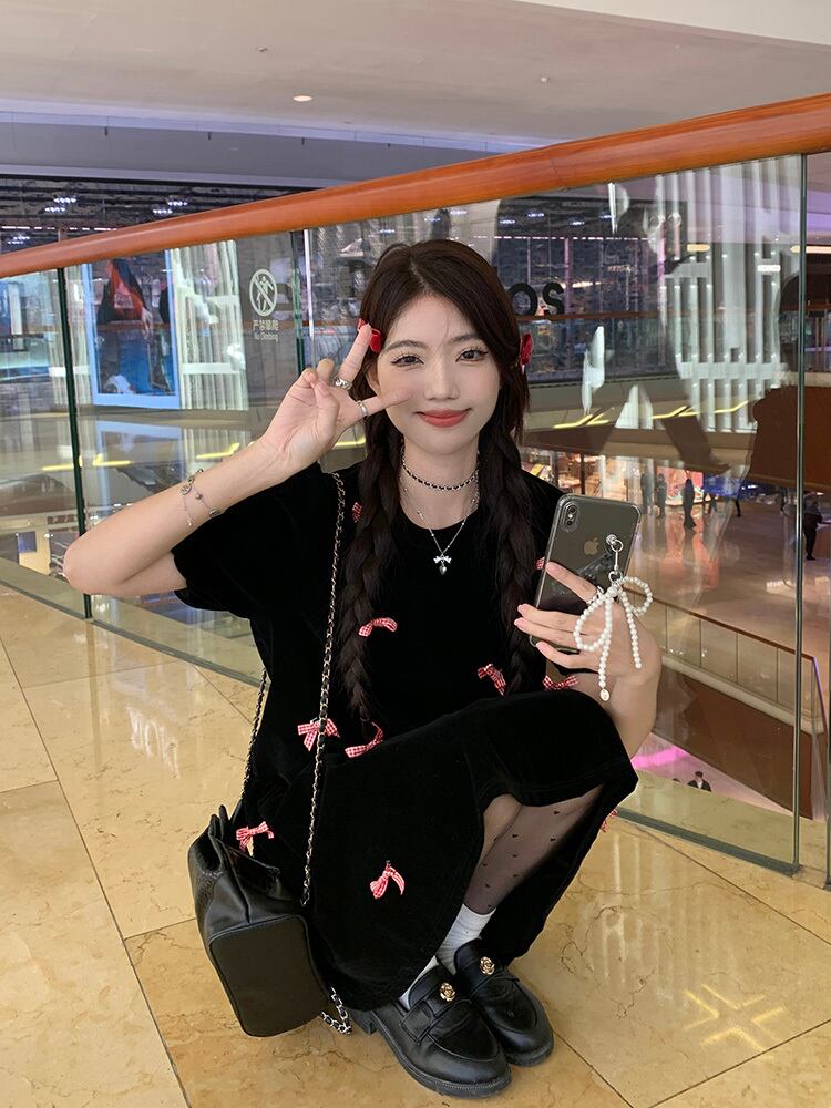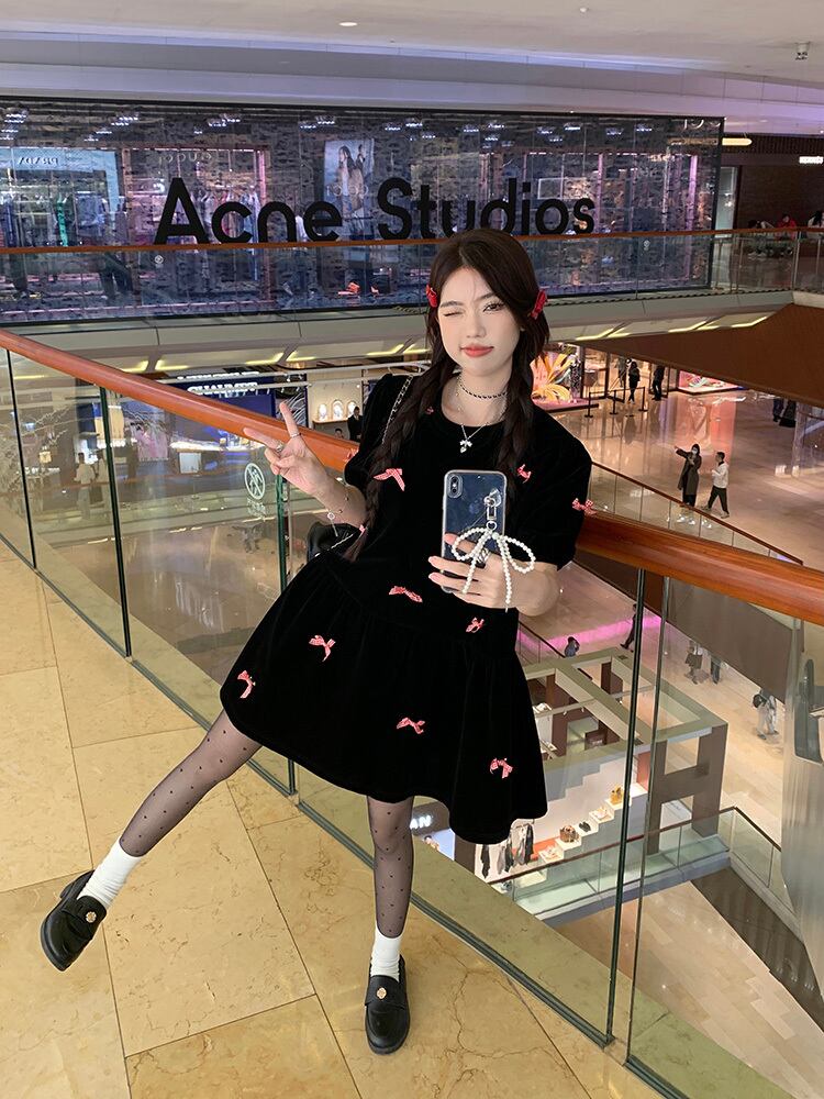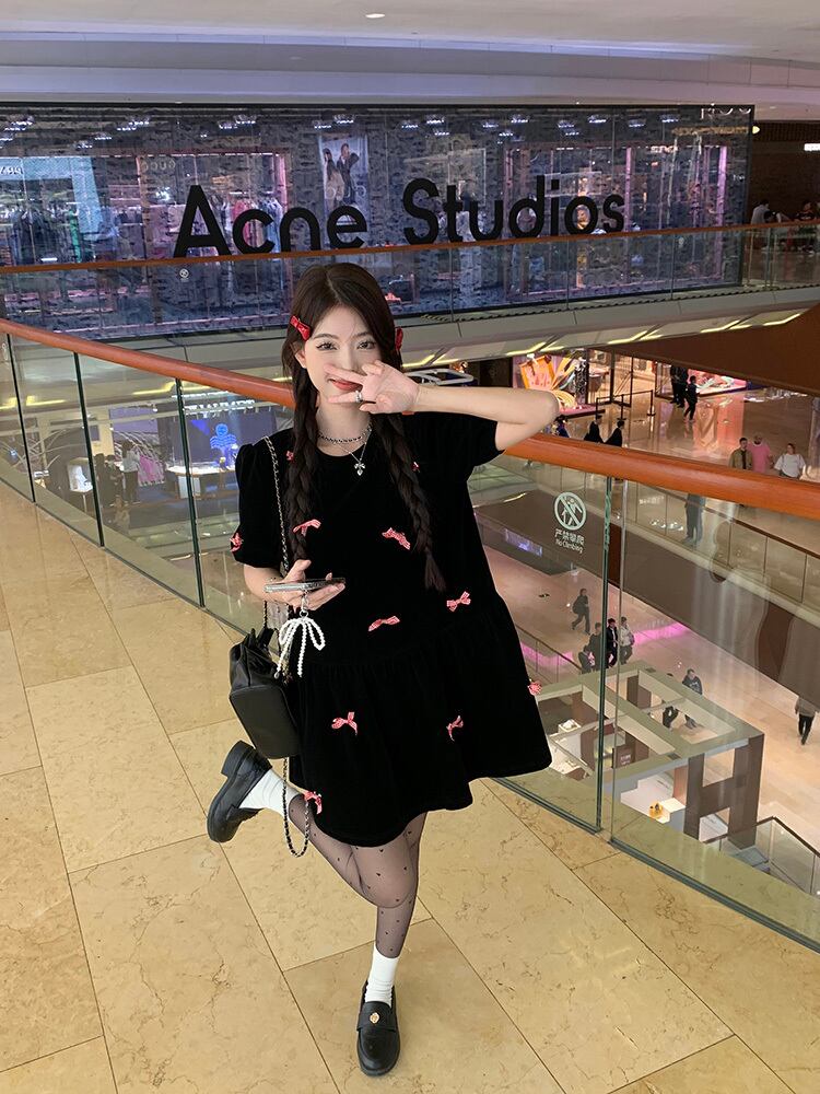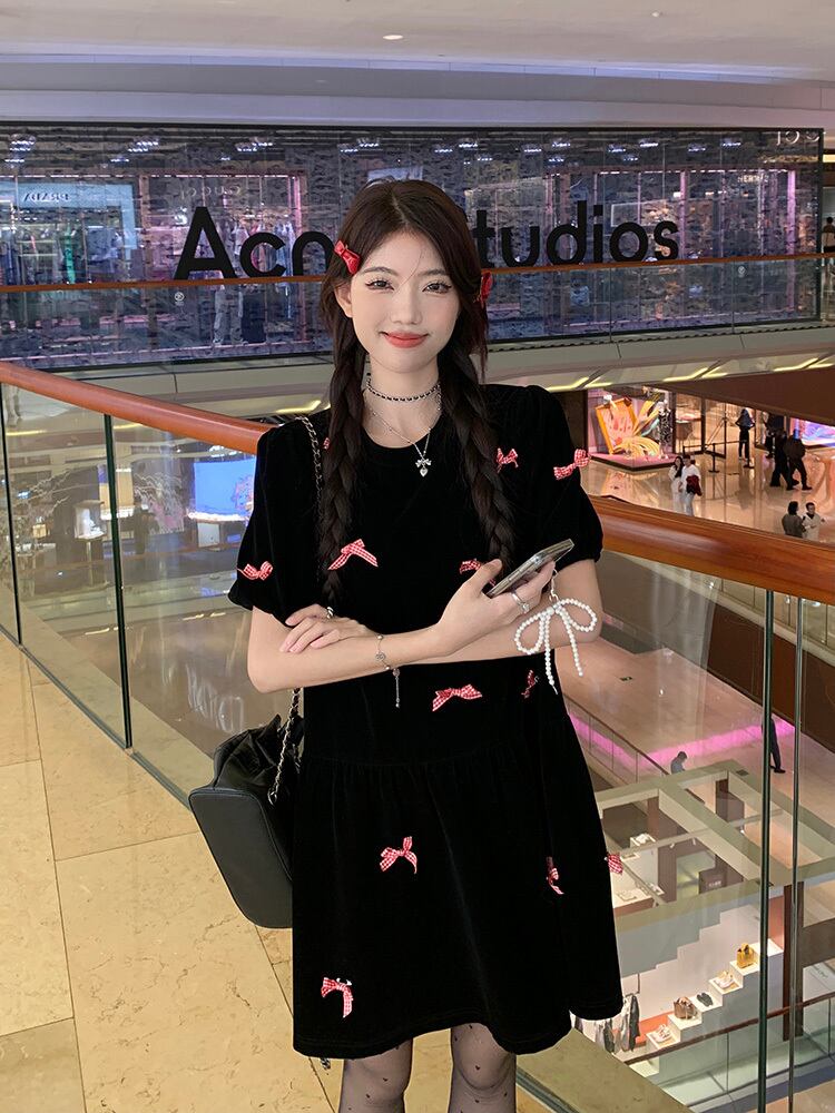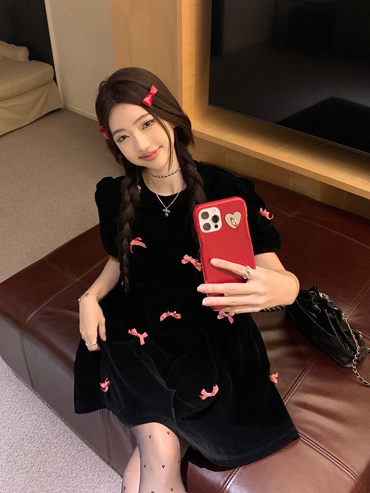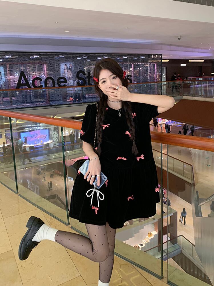 シックなベルベット生地にプチリボンが映える半袖ワンピースです